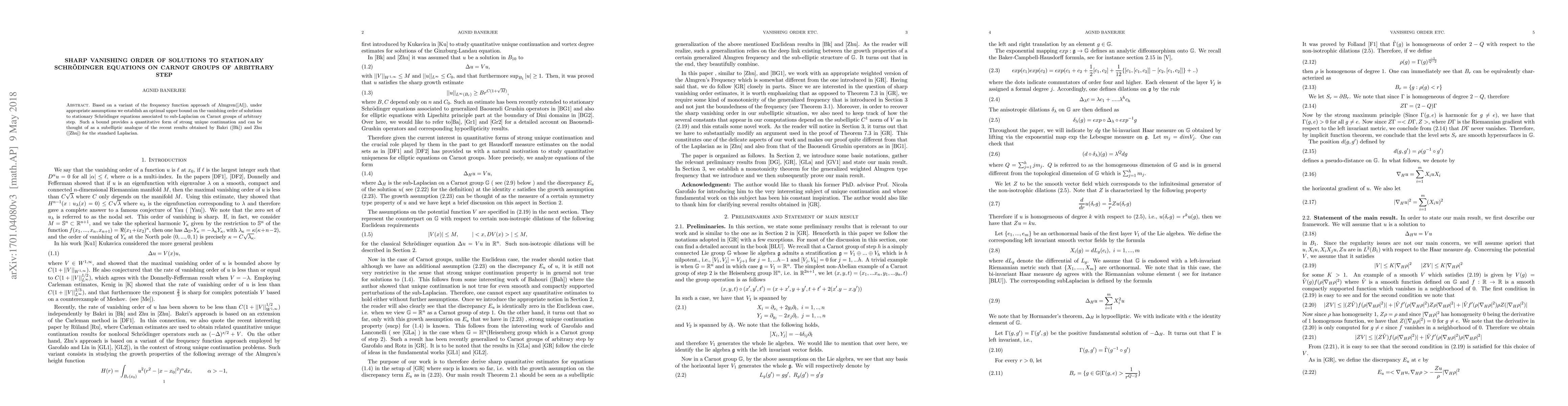 Based on a variant of the frequency function approach of Almgren([Al]), we establish an optimal upper bound on the vanishing order of solutions to stationary Schr\"odinger equations associated to sub-Laplacian on Carnot groups of arbitrary step. Such bound provides a quantitative form of strong unique continuation and can be thought of as an analogue of the recent results of Bakri and Zhu for the standard Laplacian.