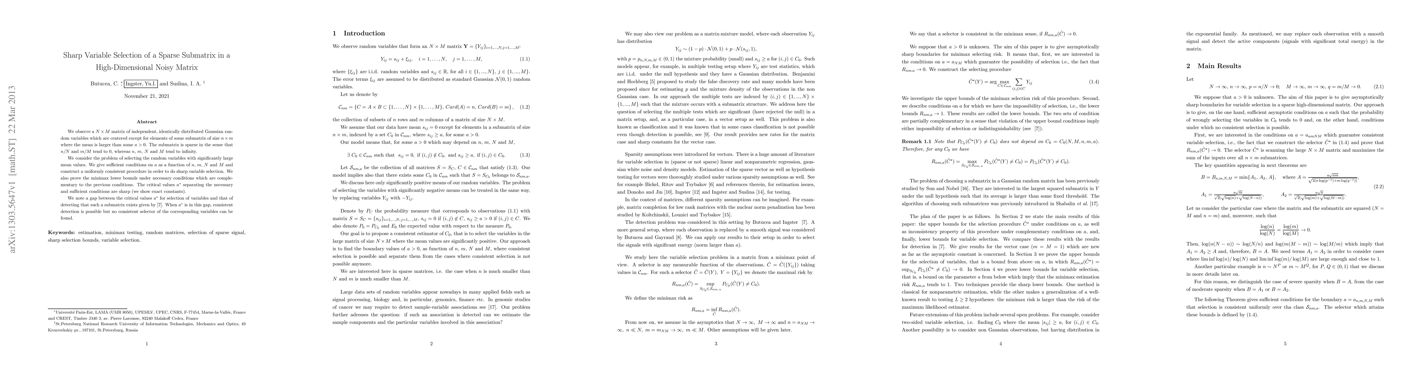 This paper addresses the problem of identifying a sparse submatrix within a high-dimensional noisy matrix where some elements have significantly larger mean values. It proposes a uniformly consistent procedure for sharp variable selection and proves minimax lower bounds, demonstrating the exact critical values for both conditions.