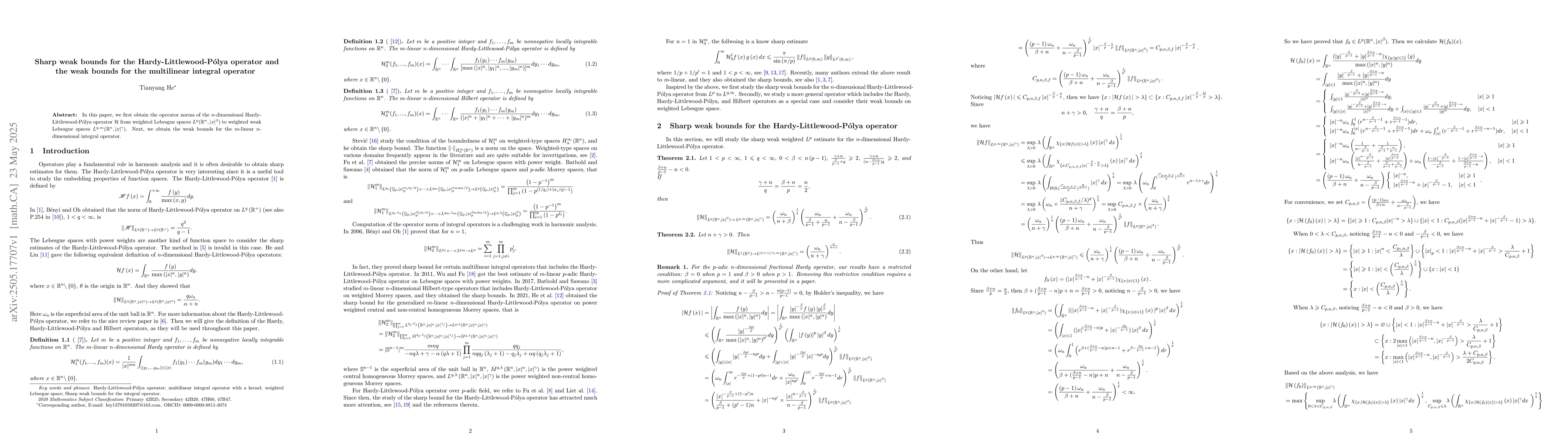 The paper presents sharp weak bounds for the Hardy-Littlewood-Pólya operator and multilinear integral operators, advancing knowledge in operator theory and functional analysis.