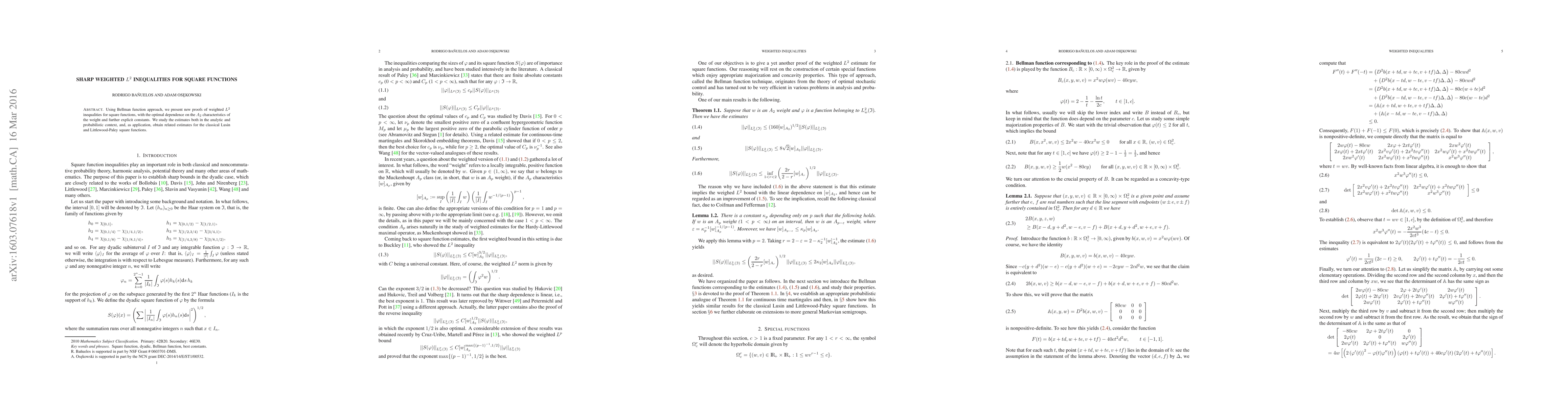 This paper presents new proofs of weighted $L^2$ inequalities for square functions using the Bellman function approach, achieving optimal dependence on the $A_2$ characteristics of the weight with explicit constants. The study extends to both analytic and probabilistic contexts, with applications to the classical Lusin and Littlewood-Paley square functions.
