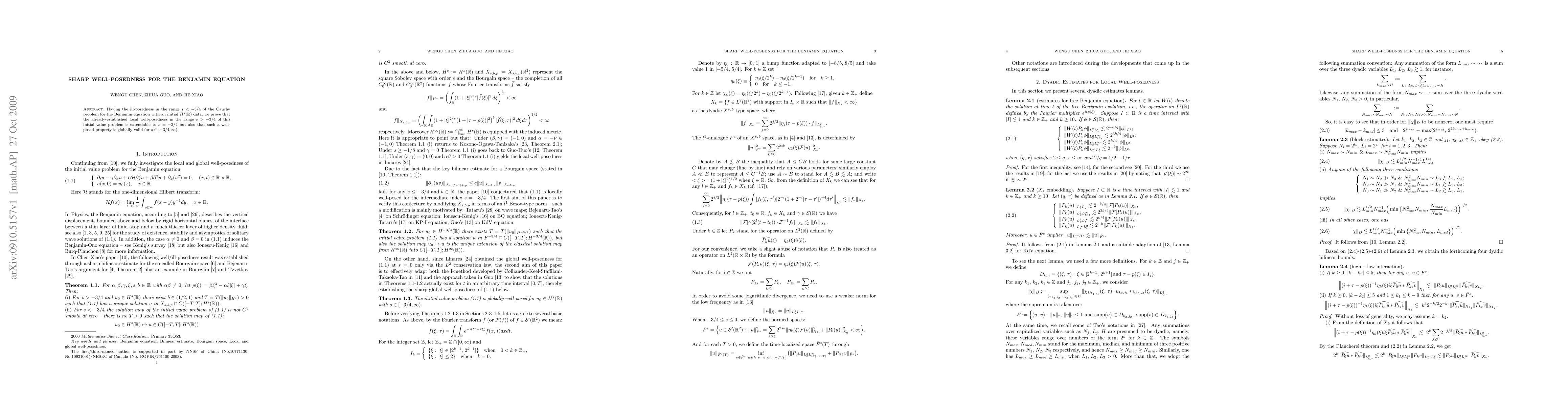 Researchers extend local well-posedness of the Benjamin equation to include initial data with negative regularity $s=-3/4$, and demonstrate global well-posedness for $s ext{ in }[-3/4, ext{infty)}$.