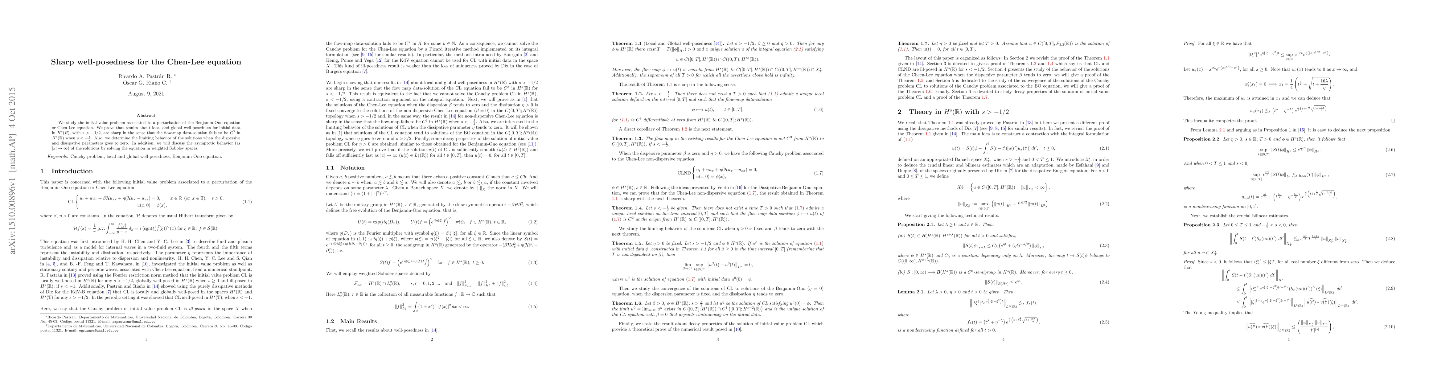 We study the initial value problem associated to a perturbation of the Benjamin-Ono equation or Chen-Lee equation. We prove that results about local and global well-posedness for initial data in $H^s(R)$, with $s>-1/2$, are sharp in the sense that the flow-map data-solution fails to be $C^3$ in $H^s(\mathbb{R})$ when $s<-\frac{1}{2}$. Also, we determine the limiting behavior of the solutions when the dispersive and dissipative parameters goes to zero. In addition, we will discuss the asymptotic behavior (as $|x|\to \infty$) of the solutions by solving the equation in weighted Sobolev spaces.