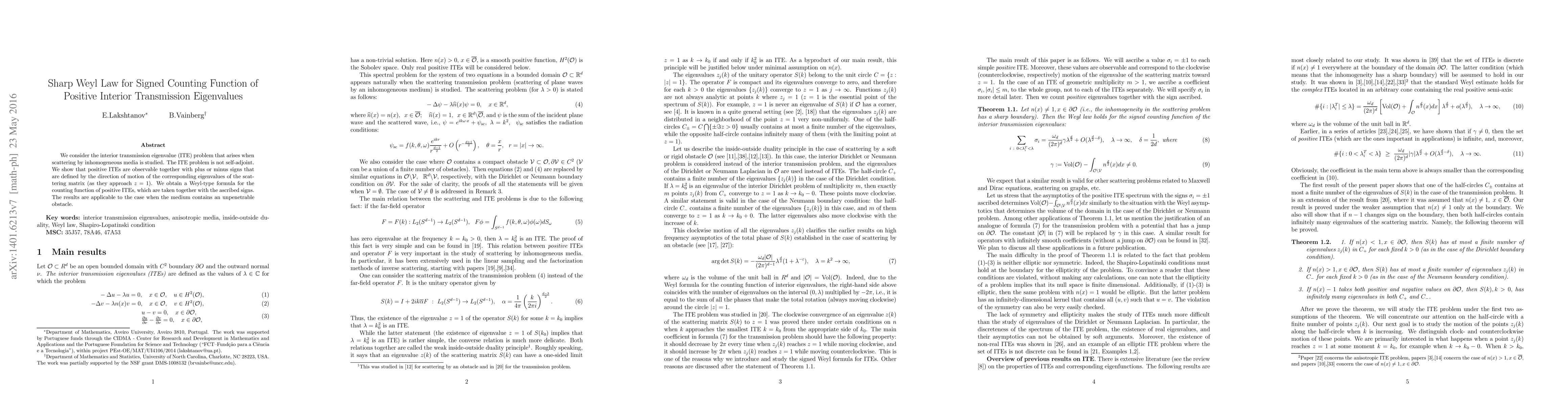 This paper addresses the interior transmission eigenvalue (ITE) problem in inhomogeneous media, demonstrating that positive ITEs can be observed with associated signs based on scattering matrix behavior. It establishes a Weyl law for the signed counting function of these eigenvalues.