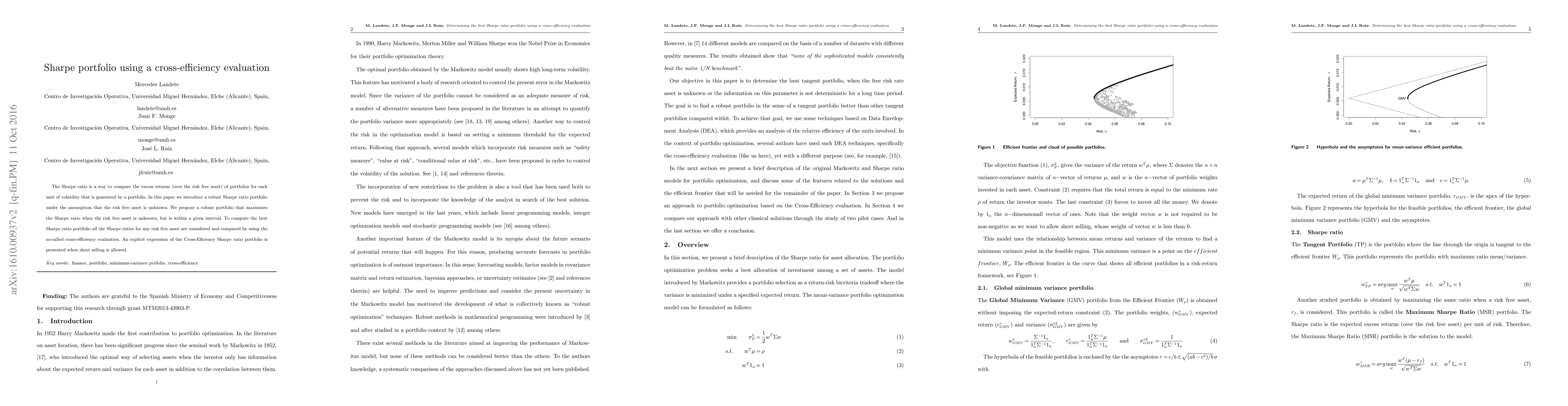 The Sharpe ratio is a way to compare the excess returns (over the risk free asset) of portfolios for each unit of volatility that is generated by a portfolio. In this paper we introduce a robust Sharpe ratio portfolio under the assumption that the risk free asset is unknown. We propose a robust portfolio that maximizes the Sharpe ratio when the risk free asset is unknown, but is within a given interval. To compute the best Sharpe ratio portfolio all the Sharpe ratios for any risk free asset are considered and compared by using the so-called cross-efficiency evaluation. An explicit expression of the Cross-Eficiency Sharpe ratio portfolio is presented when short selling is allowed.