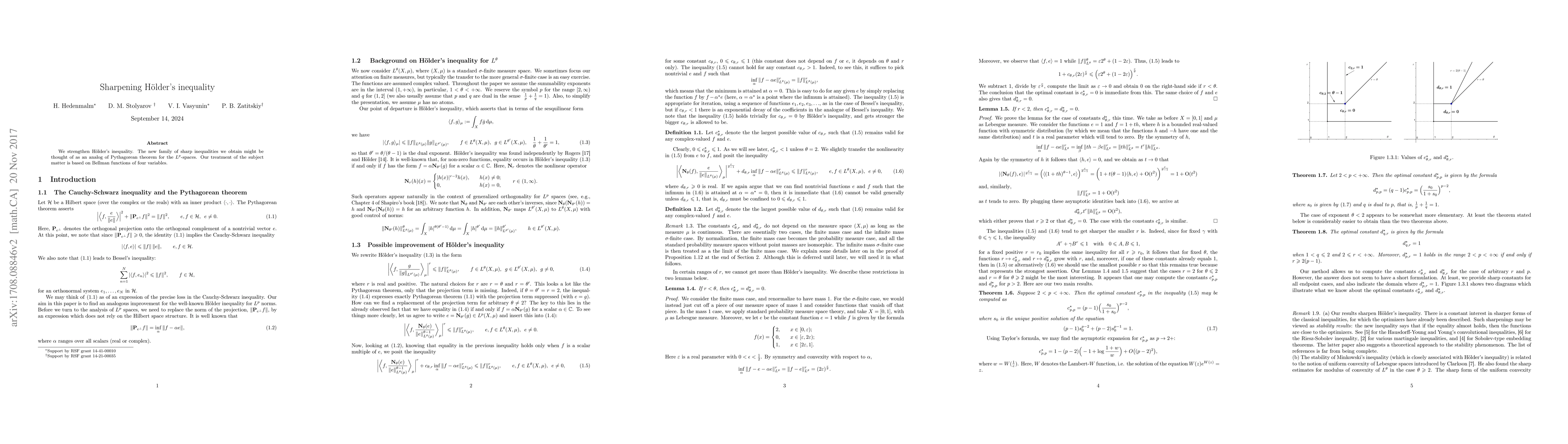 Title: Sharpening Hölder's Inequality Summary: This paper strengthens Hölder's inequality, presenting a new family of sharp inequalities analogous to the Pythagorean theorem in $L^p$ spaces, utilizing Bellman functions of four variables for its derivation.