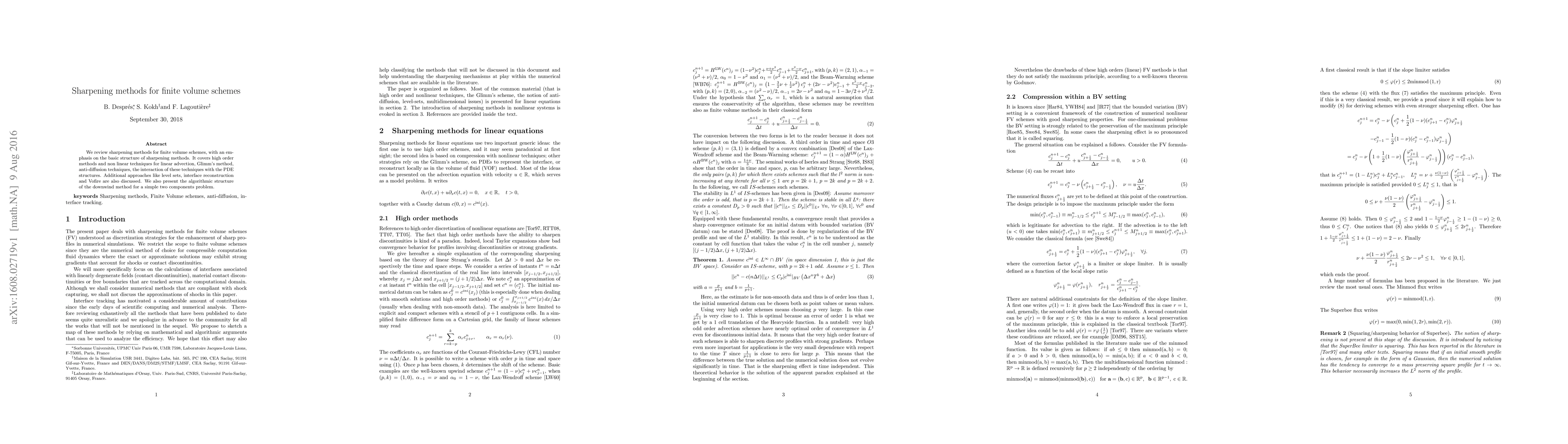 We review sharpening methods for finite volume schemes, with an emphasis on the basic structure of sharpening methods. It covers high order methods and non linear techniques for linear advection, Glimm's method, anti-diffusion techniques, the interaction of these techniques with the PDE structures. Additional approaches like level sets, interface reconstruction and Vofire are also discussed. We also present the algorithmic structure of the downwind method for a simple two components problem.