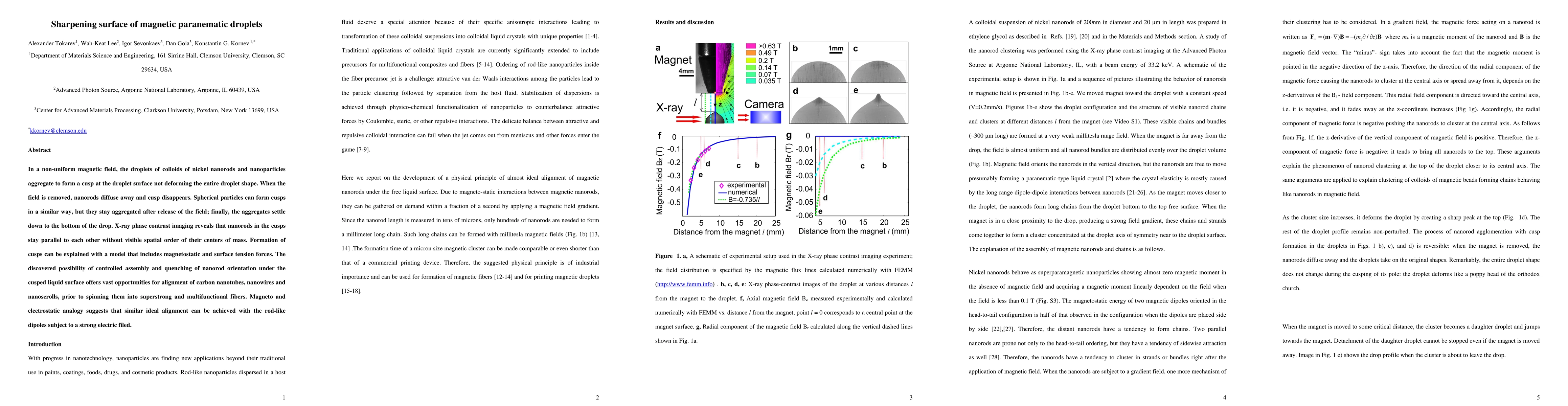 In a non-uniform magnetic field, the droplets of colloids of nickel nanorods and nanoparticles aggregate to form a cusp at the droplet surface not deforming the entire droplet shape. When the field is removed, nanorods diffuse away and cusp disappears. Spherical particles can form cusps in a similar way, but they stay aggregated after release of the field; finally, the aggregates settle down to the bottom of the drop. X-ray phase contrast imaging reveals that nanorods in the cusps stay parallel to each other without visible spatial order of their centers of mass. Formation of cusps can be explained with a model that includes magnetostatic and surface tension forces. The discovered possibility of controlled assembly and quenching of nanorod orientation under the cusped liquid surface offers vast opportunities for alignment of carbon nanotubes, nanowires and nanoscrolls, prior to spinning them into superstrong and multifunctional fibers. Magneto and electrostatic analogy suggests that similar ideal alignment can be achieved with the rod-like dipoles subject to a strong electric filed.