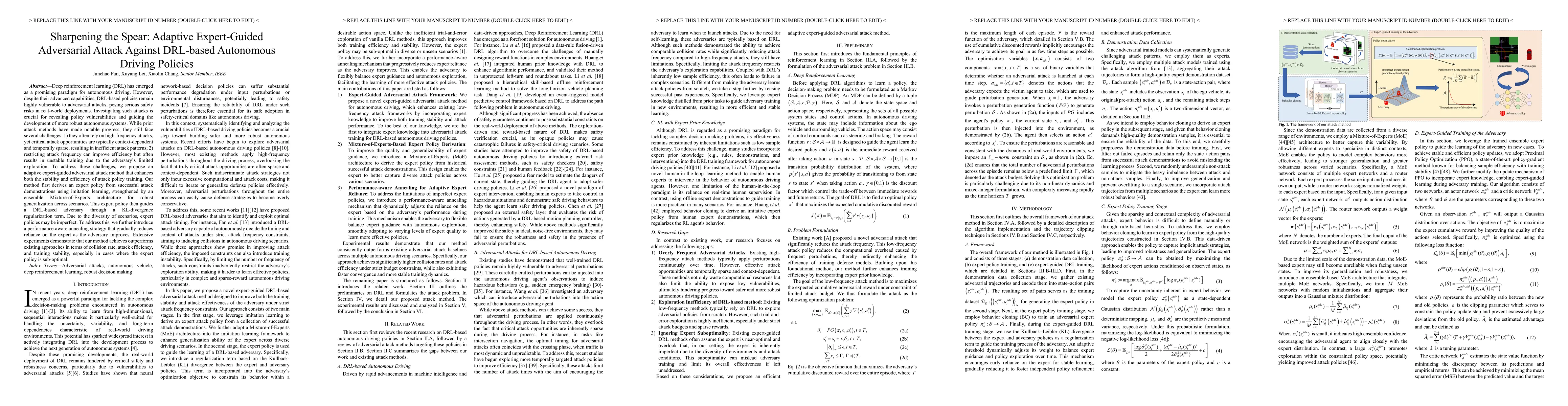 Deep reinforcement learning (DRL) has emerged as a promising paradigm for autonomous driving. However, despite their advanced capabilities, DRL-based policies remain highly vulnerable to adversarial attacks, posing serious safety risks in real-world deployments. Investigating such attacks is crucial for revealing policy vulnerabilities and guiding the development of more robust autonomous systems. While prior attack methods have made notable progress, they still face several challenges: 1) they often rely on high-frequency attacks, yet critical attack opportunities are typically context-dependent and temporally sparse, resulting in inefficient attack patterns; 2) restricting attack frequency can improve efficiency but often results in unstable training due to the adversary's limited exploration. To address these challenges, we propose an adaptive expert-guided adversarial attack method that enhances both the stability and efficiency of attack policy training. Our method first derives an expert policy from successful attack demonstrations using imitation learning, strengthened by an ensemble Mixture-of-Experts architecture for robust generalization across scenarios. This expert policy then guides a DRL-based adversary through a KL-divergence regularization term. Due to the diversity of scenarios, expert policies may be imperfect. To address this, we further introduce a performance-aware annealing strategy that gradually reduces reliance on the expert as the adversary improves. Extensive experiments demonstrate that our method achieves outperforms existing approaches in terms of collision rate, attack efficiency, and training stability, especially in cases where the expert policy is sub-optimal.