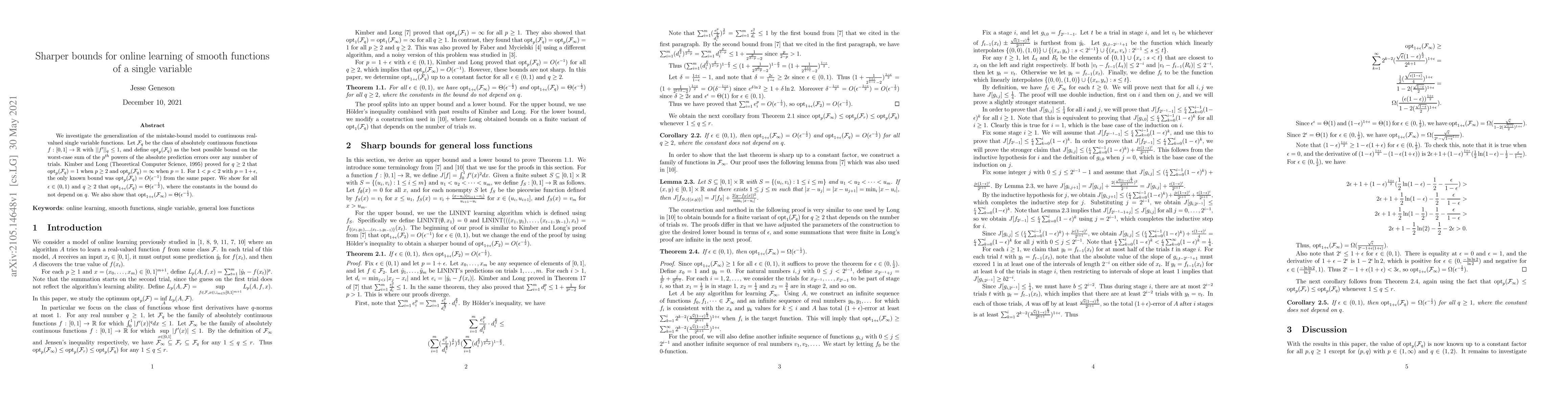 This research paper improves bounds for online learning algorithms of smooth, single-variable real-valued functions. It shows that for $1 < p < 2$ with $p = 1+epsilon$, the optimal bound $opt_{1+epsilon}(mathcal{F}_q)$ is $Theta(epsilon^{-rac{1}{2}})$, enhancing previous results. The constants in these bounds are independent of $q$, and similar bounds are established for the class $mathcal{F}_{infty}$.