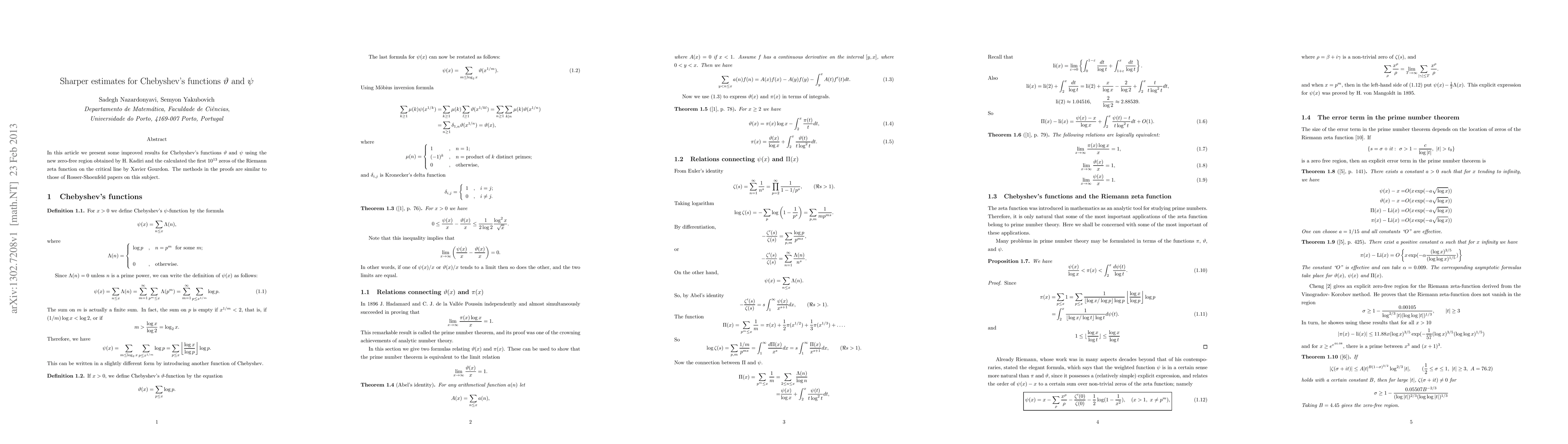 This paper presents improved estimates for Chebyshev's functions vartheta and psi using new zero-free region and calculated zeros of the Riemann zeta function.
