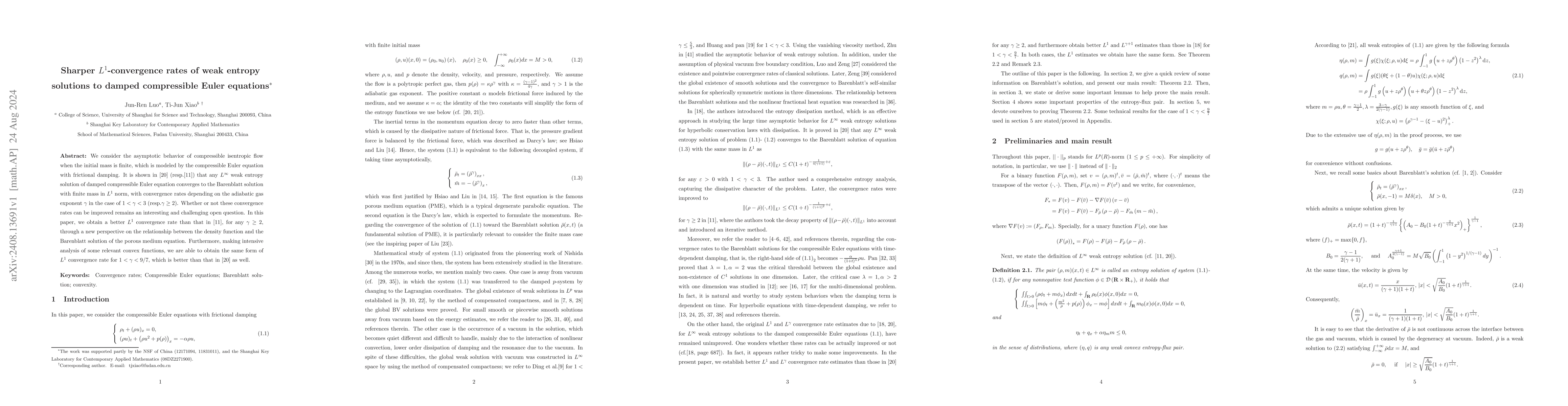 The research employs a combination of analytical techniques and numerical simulations to study the asymptotic behavior of weak entropy solutions for damped compressible Euler equations with finite initial mass. It builds upon previous works on convergence rates for similar systems.
