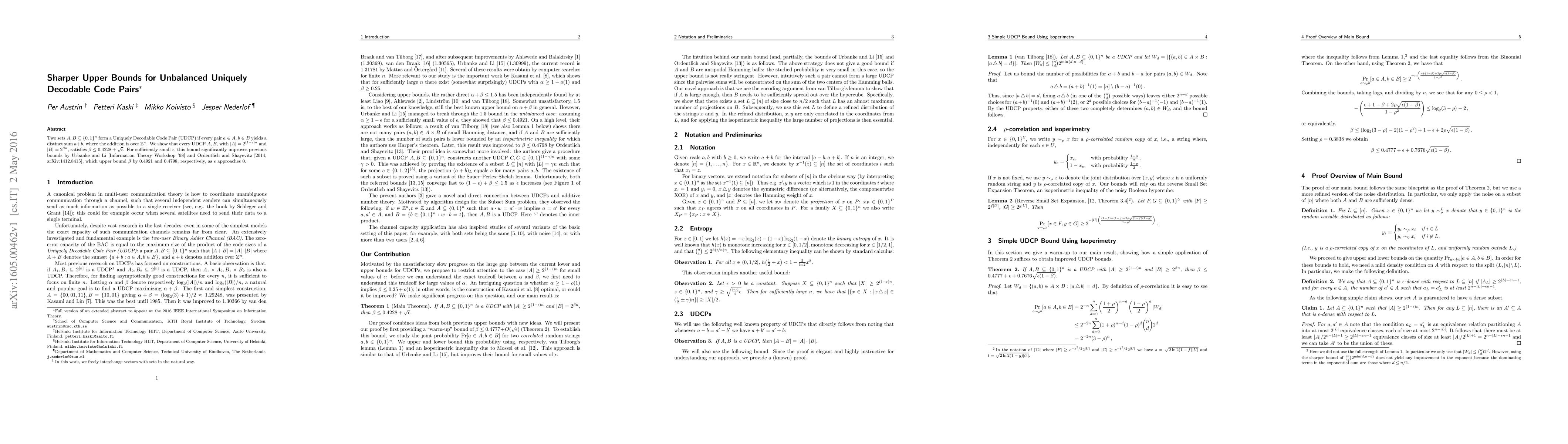 Researchers prove a tighter bound on the size of one set in a uniquely decodable code pair, improving previous estimates for small epsilon values.