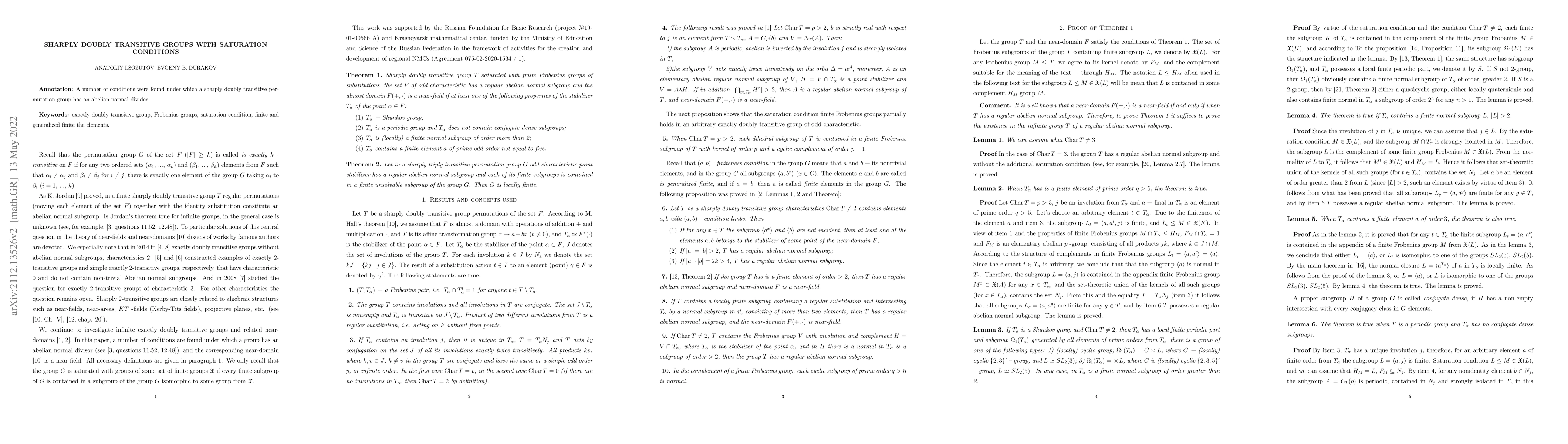 A number of conditions were found under which a sharply doubly transitive permutation group has an abelian normal divider.