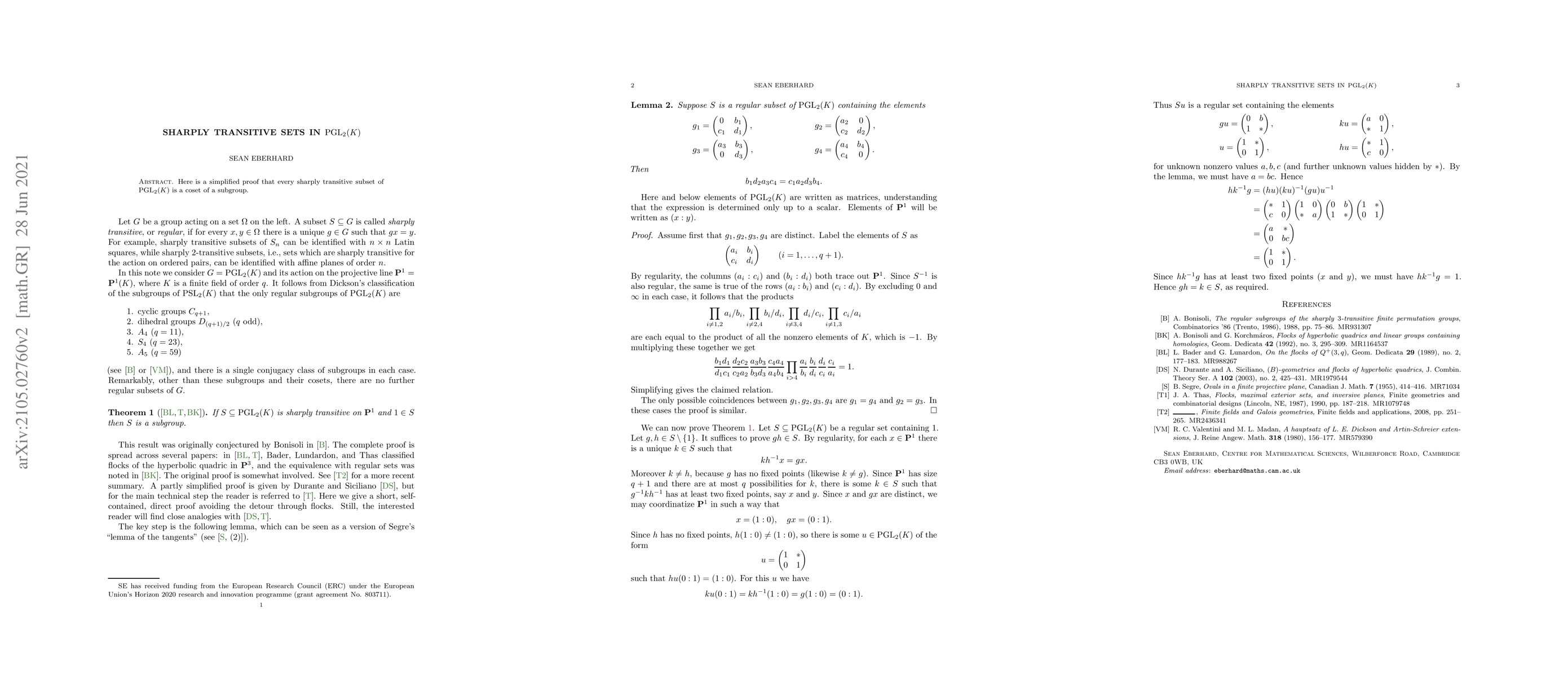 Here is a simplified proof that every sharply transitive subset of $\mathrm{PGL}_2(K)$ is a coset of a subgroup.