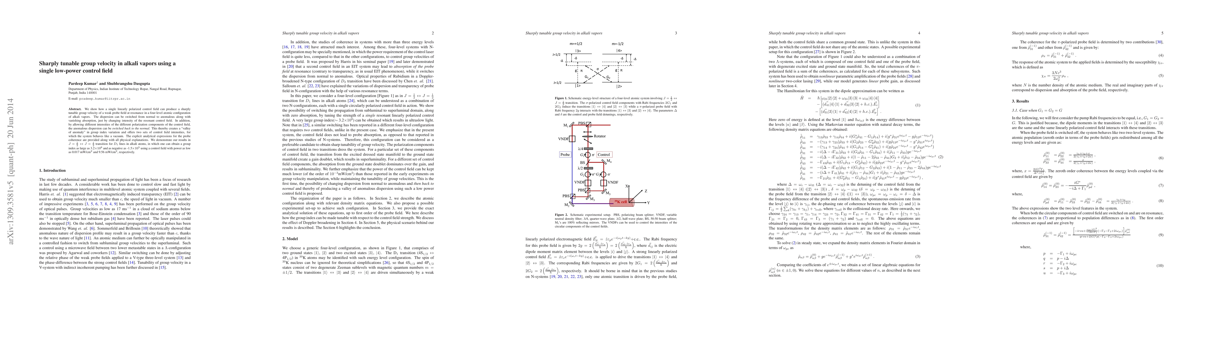 This paper demonstrates how a single low-power control field can sharply tune the group velocity of a probe field in alkali vapors, switching dispersion from normal to anomalous and achieving near-vacuum behavior. Analytical expressions for probe coherence are provided, showing group indices as high as $3.2\times10^{8}$ and as low as $-1.5\times10^{5}$ using control fields as low as 0.017 mW/cm$^2$.