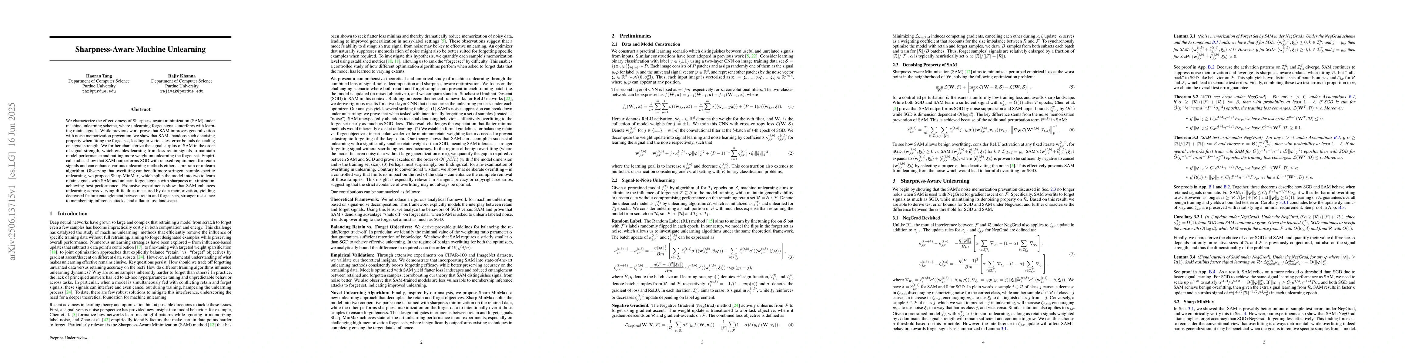 The paper characterizes the effectiveness of Sharpness-aware minimization (SAM) in machine unlearning, where unlearning forget signals interferes with learning retain signals. It proves that SAM abandons its noise memorization prevention property when fitting the forget set, leading to varying test error bounds based on signal strength.