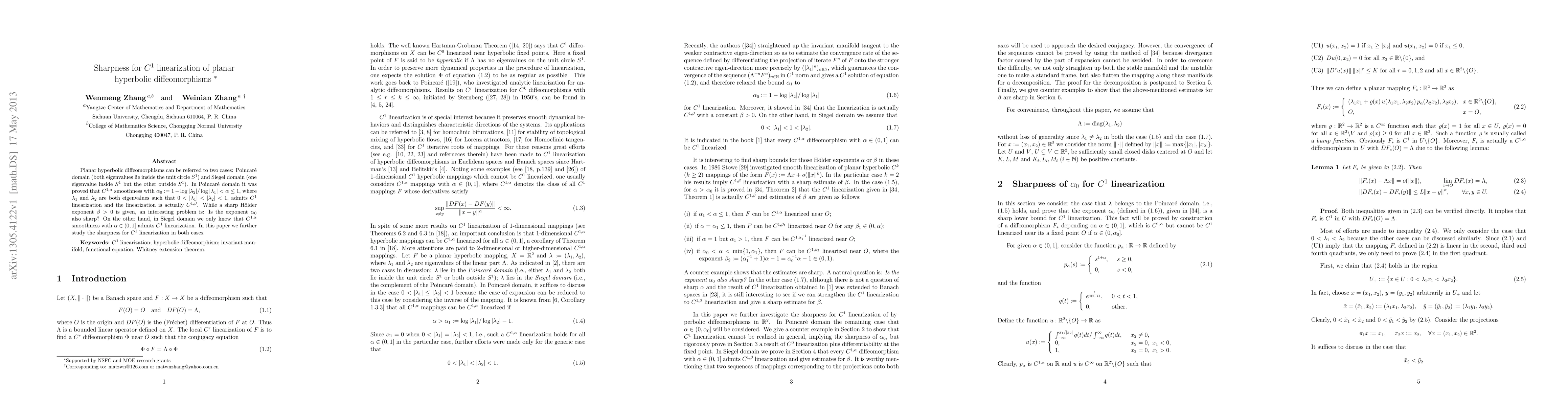 Planar hyperbolic diffeomorphisms can be referred to two cases: Poincar\'{e} domain (both eigenvalues lie inside the unit circle $S^1$) and Siegel domain (one eigenvalue inside $S^1$ but the other outside $S^1$). In Poincar\'{e} domain it was proved that $C^{1,\alpha}$ smoothness with $\alpha_0:=1-\log|\lambda_2|/\log|\lambda_1|<\alpha\le 1$, where $\lambda_1$ and $\lambda_2$ are both eigenvalues such that $0<|\lambda_1|<|\lambda_2|<1$, admits $C^1$ linearization and the linearization is actually $C^{1,\beta}$. While a sharp H\"older exponent $\beta>0$ is given, an interesting problem is: Is the exponent $\alpha_0$ also sharp? On the other hand, in Siegel domain we only know that $C^{1,\alpha}$ smoothness with $\alpha\in (0,1]$ admits $C^1$ linearization. In this paper we further study the sharpness for $C^1$ linearization in both cases.