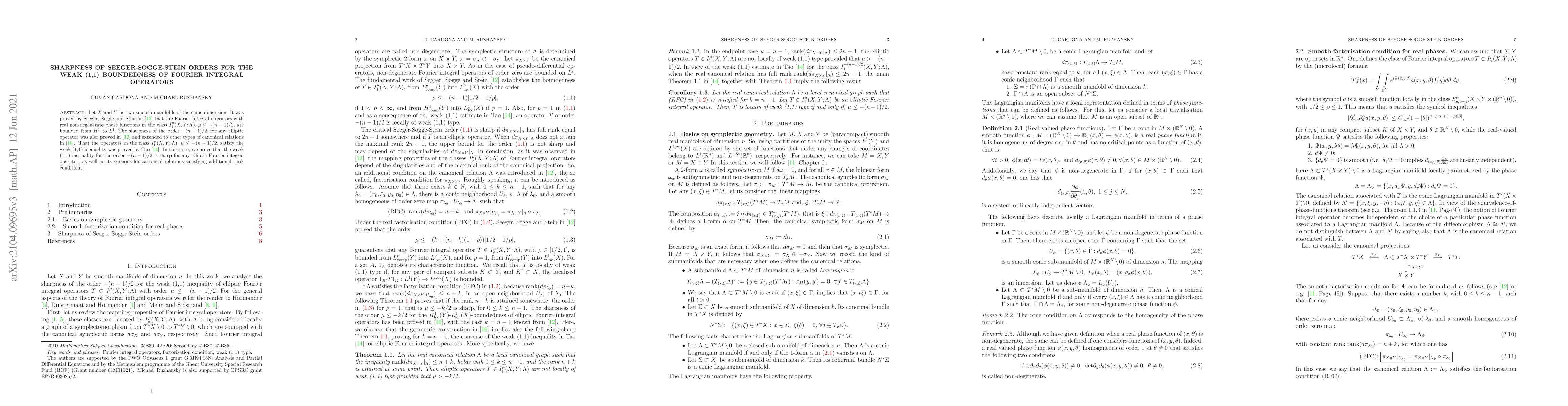 This paper proves the sharpness of the Seeger-Sogge-Stein order $-(n-1)/2$ for the weak (1,1) boundedness of elliptic Fourier integral operators and canonical relations with additional rank conditions. It extends previous results by confirming that no higher order can guarantee the weak (1,1) inequality.
