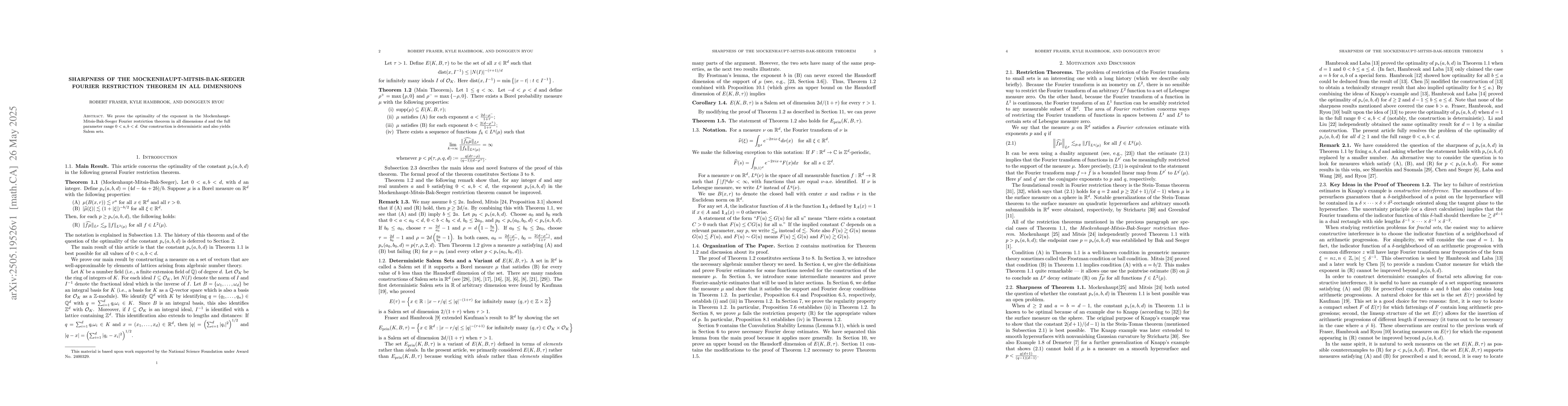 The paper presents a novel deterministic construction proving the optimality of the exponent in the Fourier restriction theorem across all dimensions.