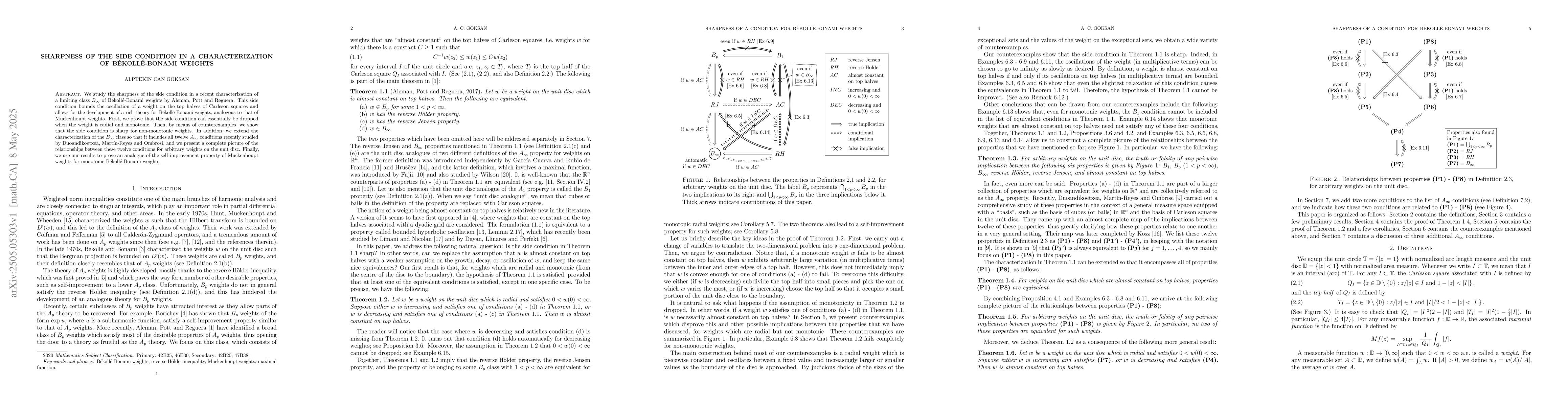 We study the sharpness of the side condition in a recent characterization of a limiting class $B_\infty$ of B\'ekoll\'e-Bonami weights by Aleman, Pott and Reguera. This side condition bounds the oscillation of a weight on the top halves of Carleson squares and allows for the development of a rich theory for B\'ekoll\'e-Bonami weights, analogous to that of Muckenhoupt weights. First, we prove that the side condition can essentially be dropped when the weight is radial and monotonic. Then, by means of counterexamples, we show that the side condition is sharp for non-monotonic weights. In addition, we extend the characterization of the $B_\infty$ class so that it includes all twelve $A_\infty$ conditions recently studied by Duoandikoetxea, Mart\'in-Reyes and Ombrosi, and we present a complete picture of the relationships between these twelve conditions for arbitrary weights on the unit disc. Finally, we use our results to prove an analogue of the self-improvement property of Muckenhoupt weights for monotonic B\'ekoll\'e-Bonami weights.