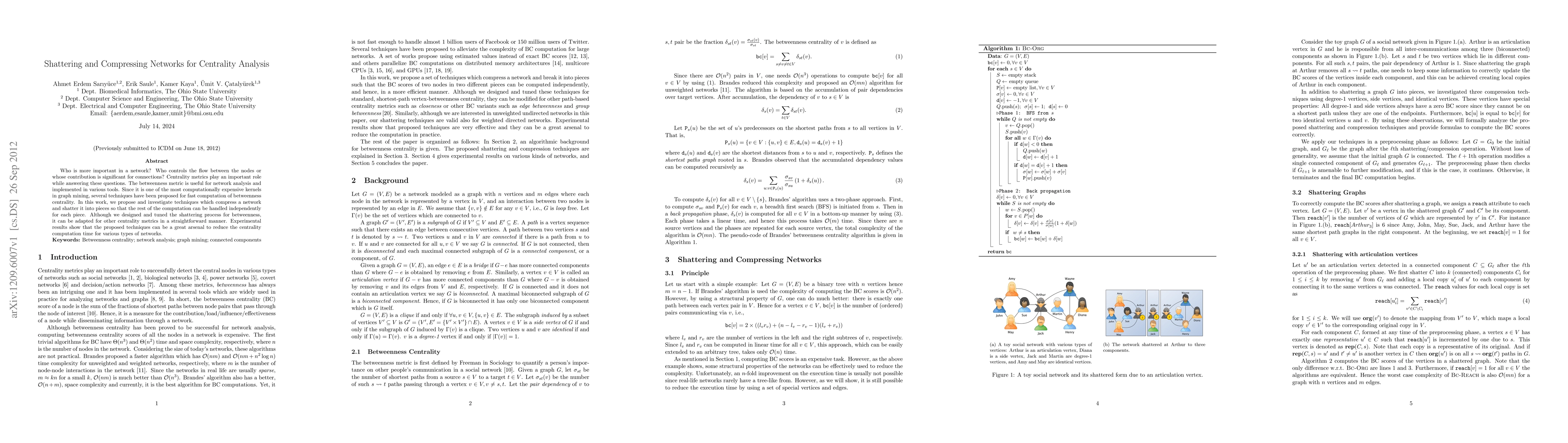 Who is more important in a network? Who controls the flow between the nodes or whose contribution is significant for connections? Centrality metrics play an important role while answering these questions. The betweenness metric is useful for network analysis and implemented in various tools. Since it is one of the most computationally expensive kernels in graph mining, several techniques have been proposed for fast computation of betweenness centrality. In this work, we propose and investigate techniques which compress a network and shatter it into pieces so that the rest of the computation can be handled independently for each piece. Although we designed and tuned the shattering process for betweenness, it can be adapted for other centrality metrics in a straightforward manner. Experimental results show that the proposed techniques can be a great arsenal to reduce the centrality computation time for various types of networks.