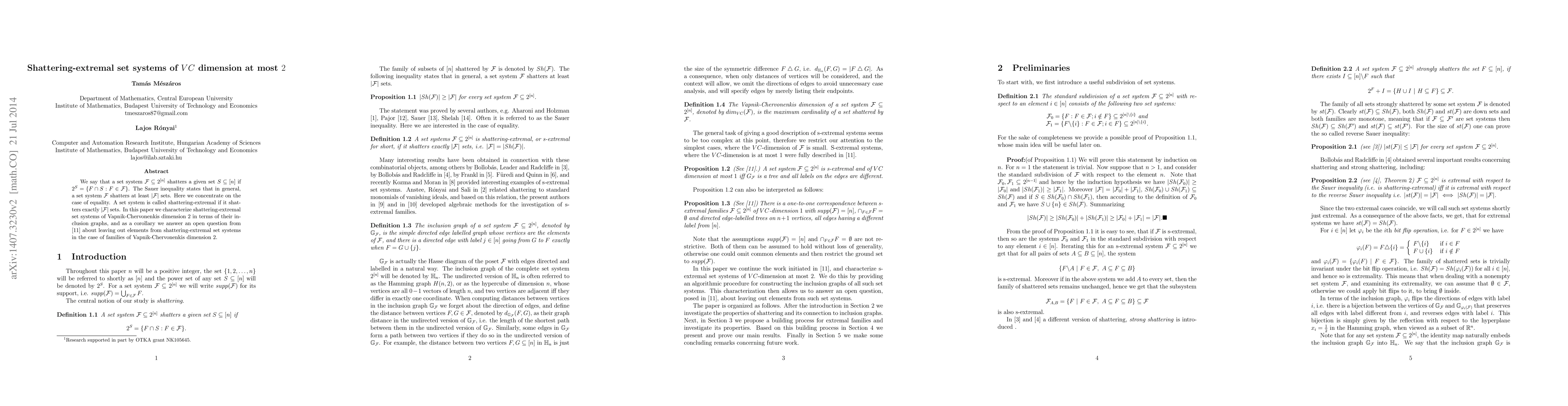 This paper characterizes shattering-extremal set systems with Vapnik-Chervonenkis (VC) dimension at most 2 in terms of their inclusion graphs and resolves an open question regarding the removal of elements from such set systems.