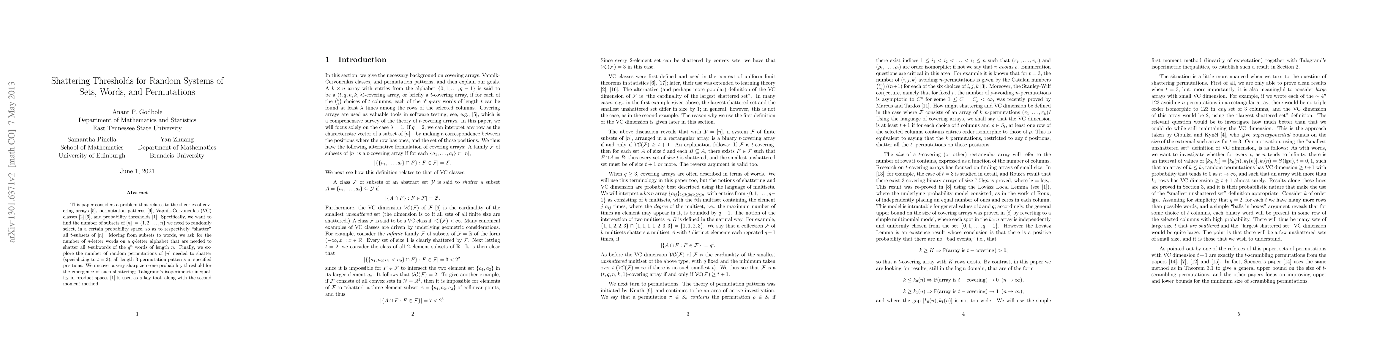 This paper considers a problem that relates to the theories of covering arrays, permutation patterns, Vapnik-Chervonenkis (VC) classes, and probability thresholds. Specifically, we want to find the number of subsets of [n]:={1,2,....,n} we need to randomly select, in a certain probability space, so as to respectively "shatter" all t-subsets of [n]. Moving from subsets to words, we ask for the number of n-letter words on a q-letter alphabet that are needed to shatter all t-subwords of the q^n words of length n. Finally, we explore the number of random permutations of [n] needed to shatter (specializing to t=3), all length 3 permutation patterns in specified positions. We uncover a very sharp zero-one probability threshold for the emergence of such shattering; Talagrand's isoperimetric inequality in product spaces is used as a key tool.