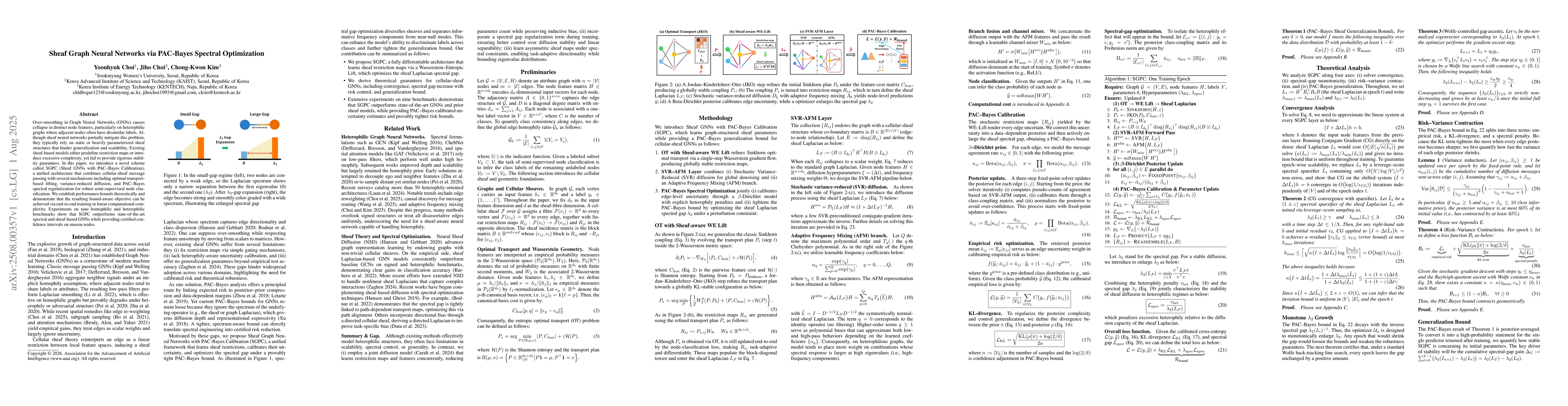 Over-smoothing in Graph Neural Networks (GNNs) causes collapse in distinct node features, particularly on heterophilic graphs where adjacent nodes often have dissimilar labels. Although sheaf neural networks partially mitigate this problem, they typically rely on static or heavily parameterized sheaf structures that hinder generalization and scalability. Existing sheaf-based models either predefine restriction maps or introduce excessive complexity, yet fail to provide rigorous stability guarantees. In this paper, we introduce a novel scheme called SGPC (Sheaf GNNs with PAC-Bayes Calibration), a unified architecture that combines cellular-sheaf message passing with several mechanisms, including optimal transport-based lifting, variance-reduced diffusion, and PAC-Bayes spectral regularization for robust semi-supervised node classification. We establish performance bounds theoretically and demonstrate that the resulting bound-aware objective can be achieved via end-to-end training in linear computational complexity. Experiments on nine homophilic and heterophilic benchmarks show that SGPC outperforms state-of-the-art spectral and sheaf-based GNNs while providing certified confidence intervals on unseen nodes.
