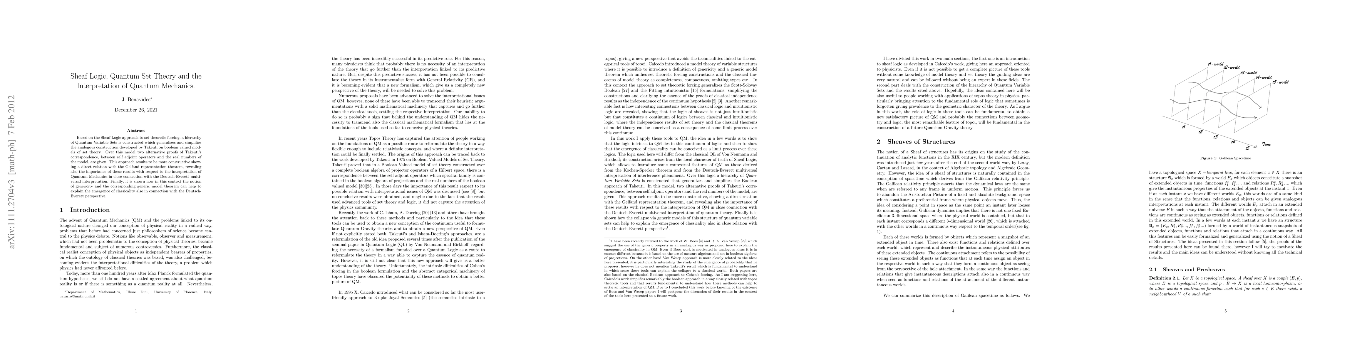 Based on the Sheaf Logic approach to set theoretic forcing, a hierarchy of Quantum Variable Sets is constructed which generalizes and simplifies the analogous construction developed by Takeuti on boolean valued models of set theory. Over this model two alternative proofs of Takeuti's correspondence, between self adjoint operators and the real numbers of the model, are given. This approach results to be more constructive showing a direct relation with the Gelfand representation theorem, revealing also the importance of these results with respect to the interpretation of Quantum Mechanics in close connection with the Deutsch-Everett multiversal interpretation. Finally, it is shown how in this context the notion of genericity and the corresponding generic model theorem can help to explain the emergence of classicality also in connection with the Deutsch- Everett perspective.