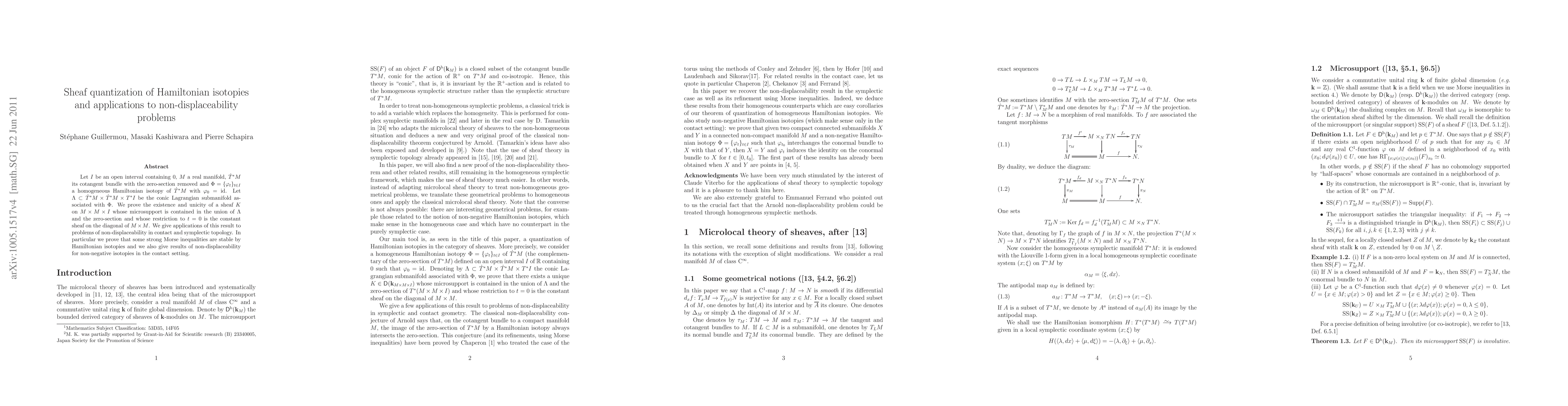 Let I be an open interval, M be a real manifold, T*M its cotangent bundle and \Phi={\phi_t}, t in I, a homogeneous Hamiltonian isotopy of T*M defined outside the zero-section. Let \Lambda be the conic Lagrangian submanifold associated with \Phi (\Lambda is a subset of T*M x T*M x T*I). We prove the existence and unicity of a sheaf K on MxMxI whose microsupport is contained in the union of \Lambda and the zero-section and whose restriction to t=0 is the constant sheaf on the diagonal of MxM. We give applications of this result to problems of non displaceability in contact and symplectic topology. In particular we prove that some strong Morse inequalities are stable by Hamiltonian isotopies and we also give results of non displaceability for positive isotopies in the contact setting. In this new version we suppress one hypothesis in the main theorem and we extend the result of non displaceability for positive isotopies.