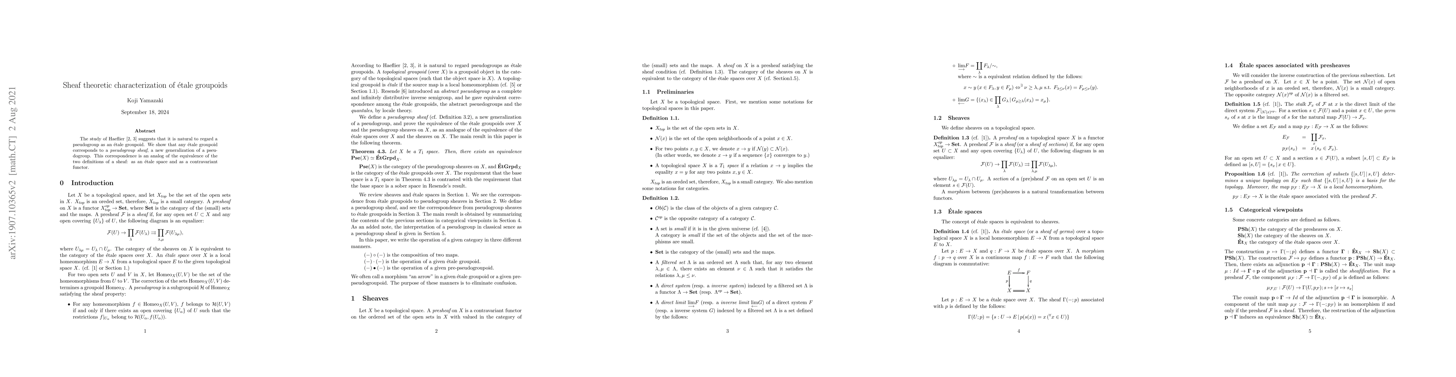 This paper establishes a sheaf theoretic characterization of etale groupoids, showing that any etale groupoid corresponds to a pseudogroup sheaf, generalizing the concept of pseudogroups. This correspondence parallels the equivalence of the two definitions of a sheaf: as an etale space and as a contravariant functor.