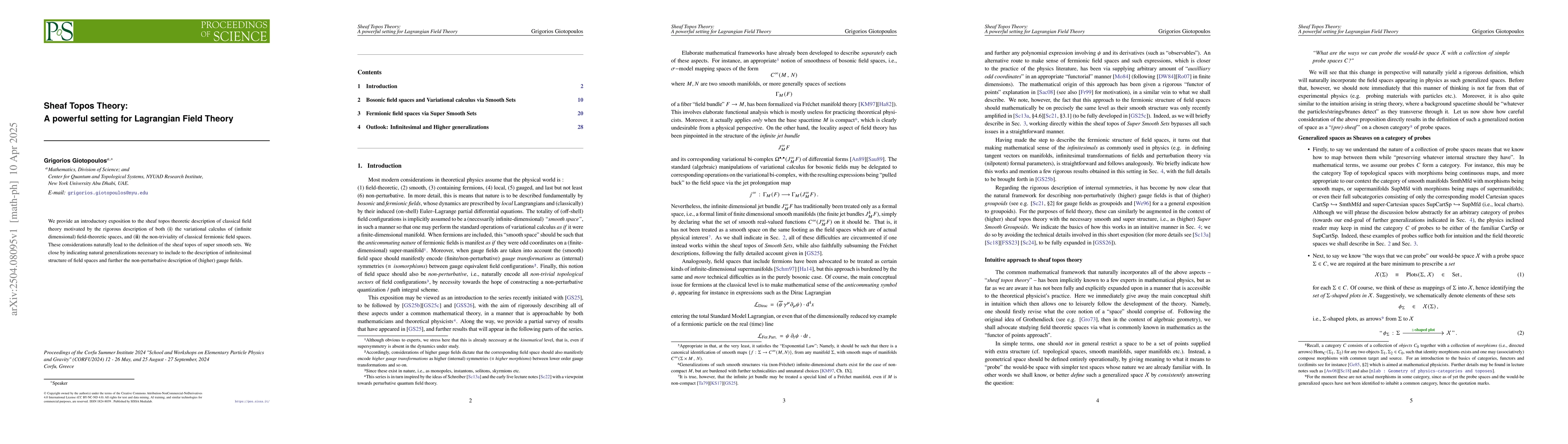 The paper introduces sheaf topos theory as a setting for classical field theory, focusing on variational calculus of infinite-dimensional field-theoretic spaces and addressing the non-triviality of classical fermionic field spaces, leading to the definition of super smooth sets.
