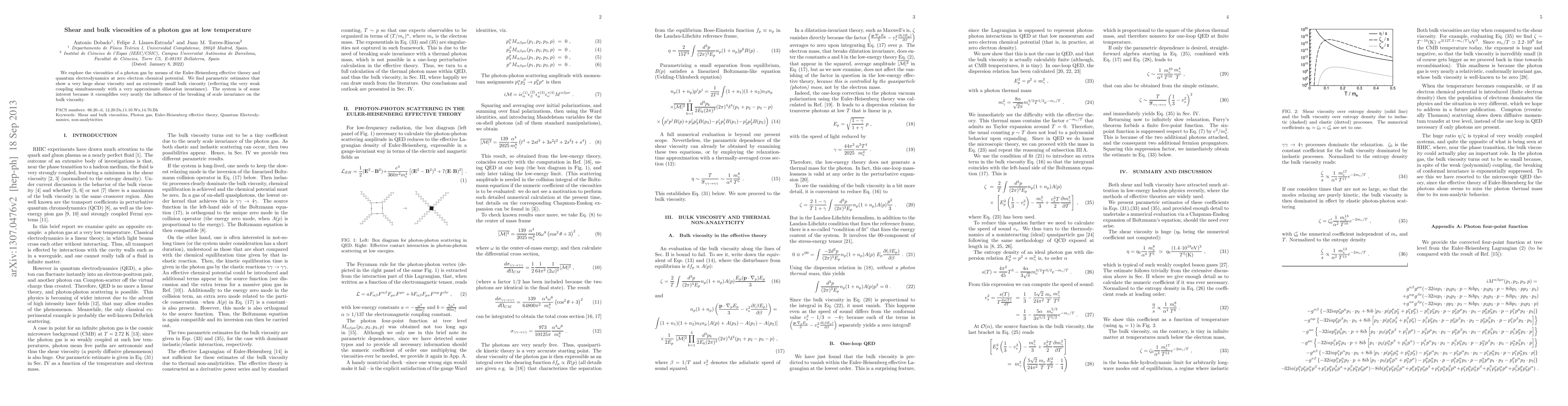 This paper investigates the viscosities of a photon gas using the Euler-Heisenberg effective theory and quantum electrodynamics, revealing a large shear viscosity and an extremely small bulk viscosity, highlighting the impact of scale invariance breaking on bulk viscosity.