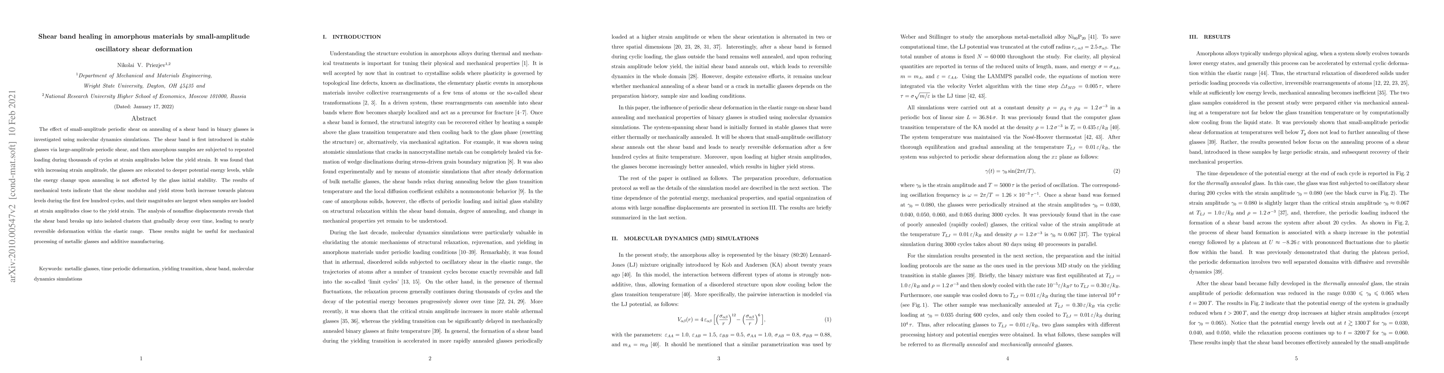 This study investigates the annealing of shear bands in binary glasses via small-amplitude oscillatory shear using molecular dynamics simulations. The results show that the shear modulus and yield stress increase towards plateau levels after several hundred cycles, indicating improved mechanical properties.