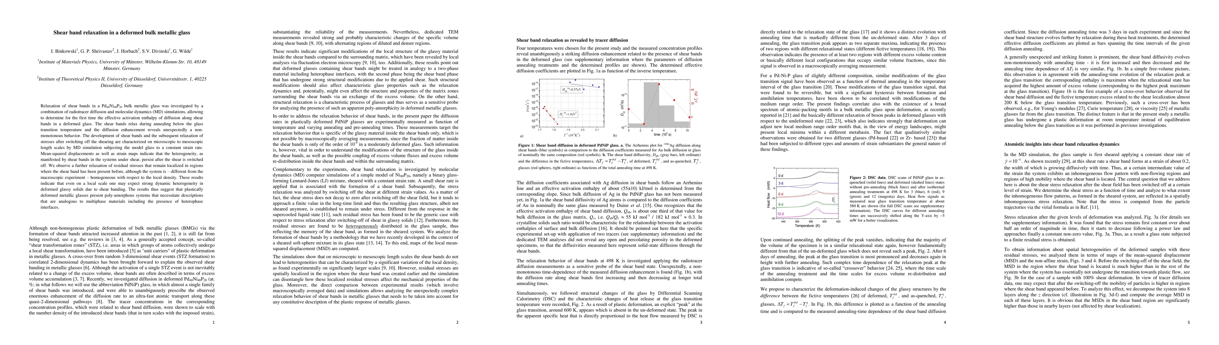 Relaxation of shear bands in a Pd40Ni40P20 bulk metallic glass was investigated by a combination of radiotracer diffusion and molecular dynamics (MD) simulations, allowing to determine for the first time the effective activation enthalpy of diffusion along shear bands in a deformed glass. The shear bands relax during annealing below the glass transition temperature and the diffusion enhancement reveals unexpectedly a non-monotonous behavior. The development of shear bands and the subsequent relaxation of stresses after switching off the shearing are characterized on microscopic to mesoscopic length scales by MD simulation subjecting the model glass to a constant strain rate. Mean-squared displacements as well as strain maps indicate that the heterogeneity, as manifested by shear bands in the systems under shear, persist after the shear is switched off. We observe a further relaxation of residual stresses that remain localized in regions where the shear band has been present before, although the system is - different from the macroscopic experiment - homogeneous with respect to the local density. These results indicate that even on a local scale one may expect strong dynamic heterogeneity in deformed glassy solids due to shear banding. The results thus suggest that plastically deformed metallic glasses present poly-amorphous systems that necessitate descriptions that are analogous to multiphase materials including the presence of heterophase interfaces.