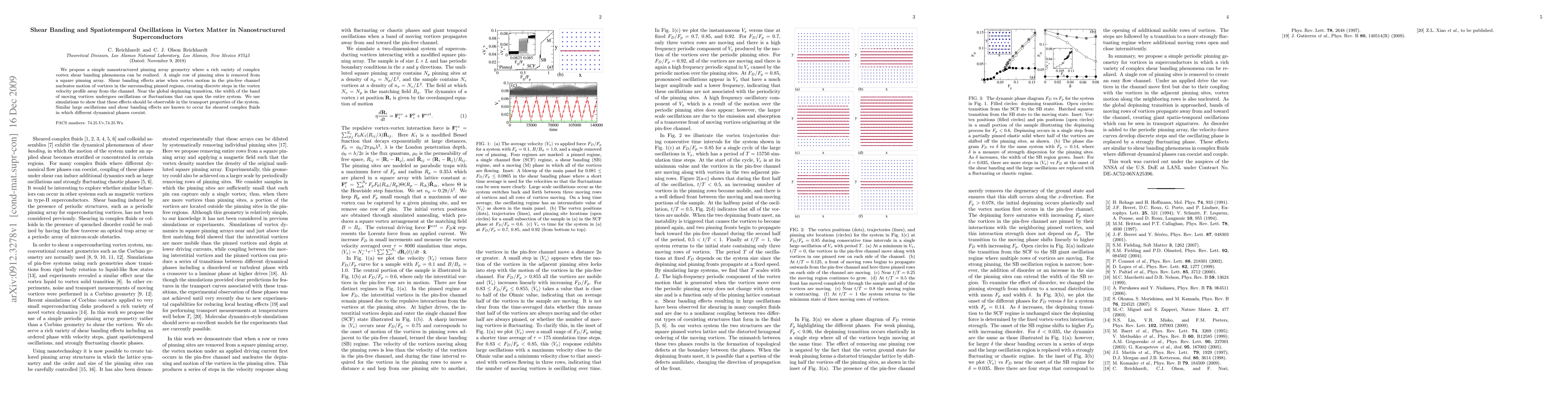 This paper investigates the complex vortex dynamics in nanostructured superconductors with a modified pinning array, demonstrating shear banding phenomena and spatiotemporal oscillations near the depinning transition. Simulations suggest these effects could be observable in the transport properties, akin to the behavior seen in sheared complex fluids.
