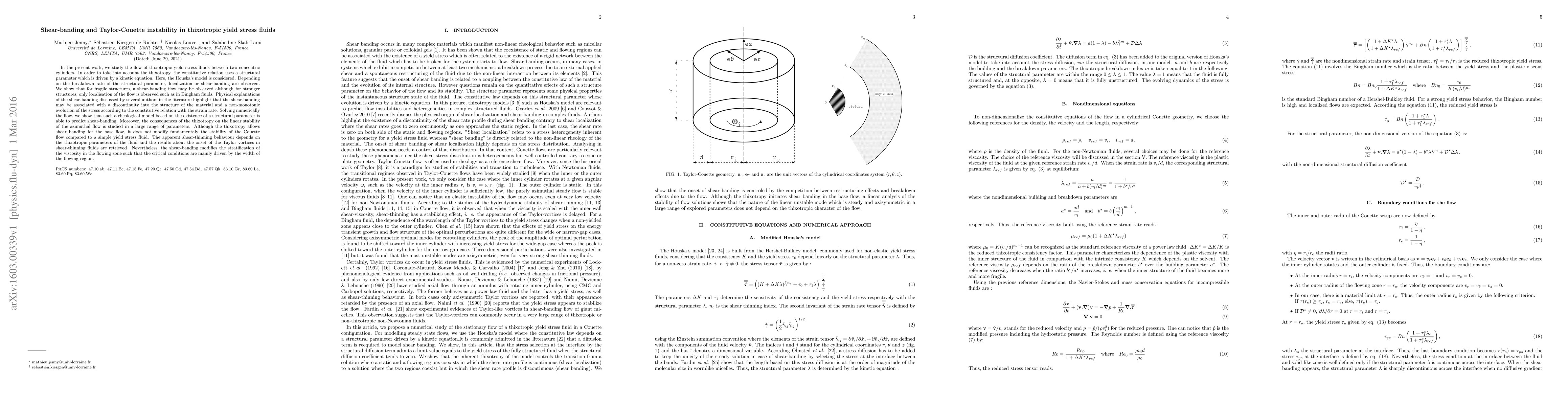 In the present work, we study the flow of thixotropic yield stress fluids between two concentric cylinders. In order to take into account the thixotropy, the constitutive relation uses a structural parameter which is driven by a kinetic equation. Here, the Houska's model is considered. Depending on the breakdown rate of the structural parameter, localization or shear-banding are observed. We show that for fragile structures, a shear-banding flow may be observed although for stronger structures, only localisation of the flow is observed such as in Bingham fluids. Physical explanations of the shear-banding discussed by several authors in the literature highlight that the shear-banding may be associated with a discontinuity into the structure of the material and a non-monotonic evolution of the stress according to the constitutive relation with the strain rate. Solving numerically the flow, we show that such a rheological model based on the existence of a structural parameter is able to predict shear-banding. Moreover, the consequences of the thixotropy on the linear stability of the azimuthal flow is studied in a large range of parameters. Although the thixotropy allows shear banding for the base flow, it does not modify fundamentaly the stability of the Couette flow compared to a simple yield stress fluid. The apparent shear-thinning behaviour depends on the thixotropic parameters of the fluid and the results about the onset of the Taylor vortices in shear-thinning fluids are retrieved. Nevertheless, the shear-banding modifies the stratification of the viscosity in the flowing zone such that the critical conditions are mainly driven by the width of the flowing region.