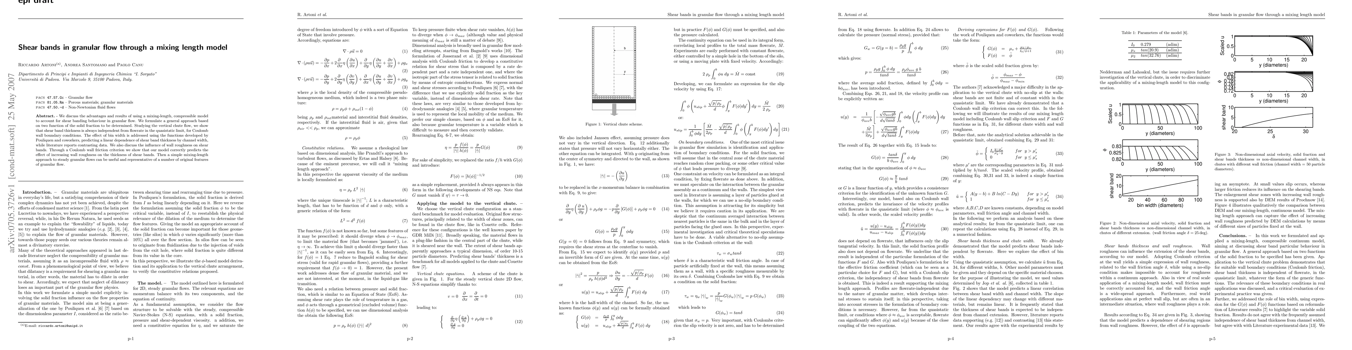 We discuss the advantages and results of using a mixing-length, compressible model to account for shear banding behaviour in granular flow. We formulate a general approach based on two function of the solid fraction to be determined. Studying the vertical chute flow, we show that shear band thickness is always independent from flowrate in the quasistatic limit, for Coulomb wall boundary conditions. The effect of bin width is addressed using the functions developed by Pouliquen and coworkers, predicting a linear dependence of shear band thickness by channel width, while literature reports contrasting data. We also discuss the influence of wall roughness on shear bands. Through a Coulomb wall friction criterion we show that our model correctly predicts the effect of increasing wall roughness on the thickness of shear bands. Then a simple mixing-length approach to steady granular flows can be useful and representative of a number of original features of granular flow.