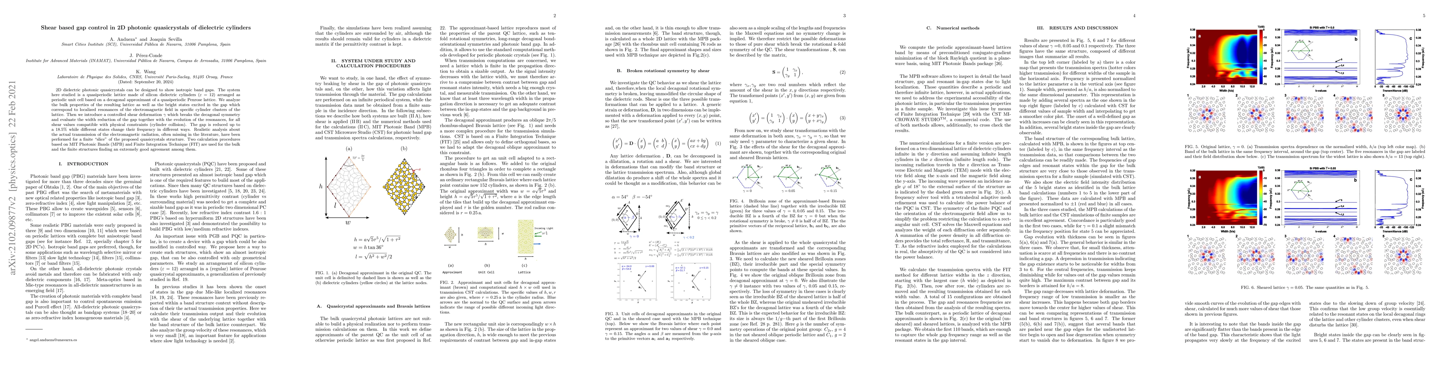 This paper investigates 2D photonic quasicrystals composed of silicon dielectric cylinders, focusing on isotropic band gaps and localized electromagnetic resonances. It introduces shear deformation to reduce the gap width by up to 18.5%, analyzes resonance frequency changes, and performs realistic electromagnetic transmission analysis using MIT Photonic Bands and Finite Integration Technique.