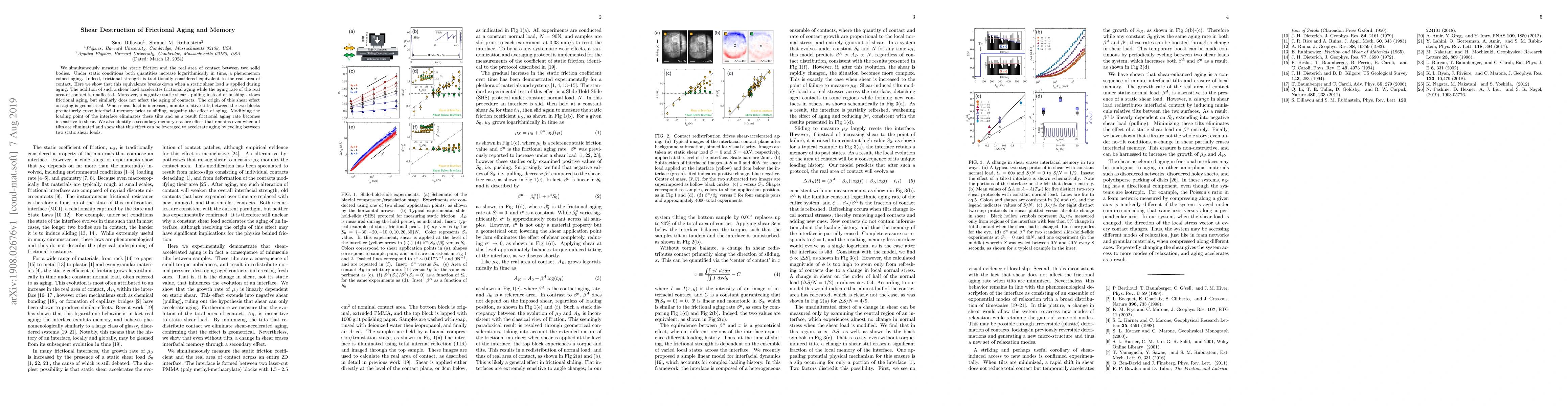 This paper investigates the impact of static shear loads on the aging of static friction and real contact area between solid bodies, revealing that shear accelerates frictional aging independently of contact area aging, due to geometrical tilts erasing interfacial memory. It also finds a secondary aging effect that can be manipulated to further accelerate aging through cyclic shear loading.