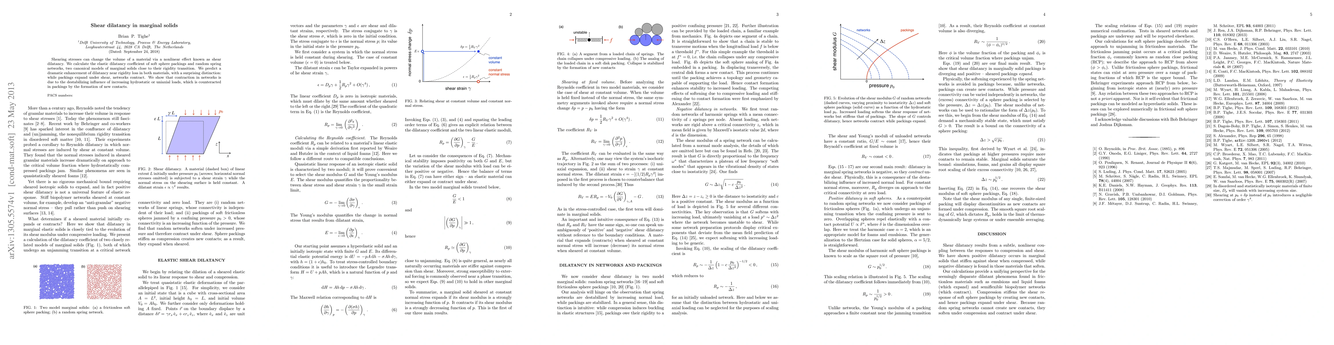 This paper investigates the phenomenon of shear dilatancy in marginal solids, predicting a significant enhancement near the rigidity transition. It finds that while soft sphere packings expand under shear, random spring networks contract due to destabilizing hydrostatic or uniaxial loads, contrasting their dilatancy behavior.
