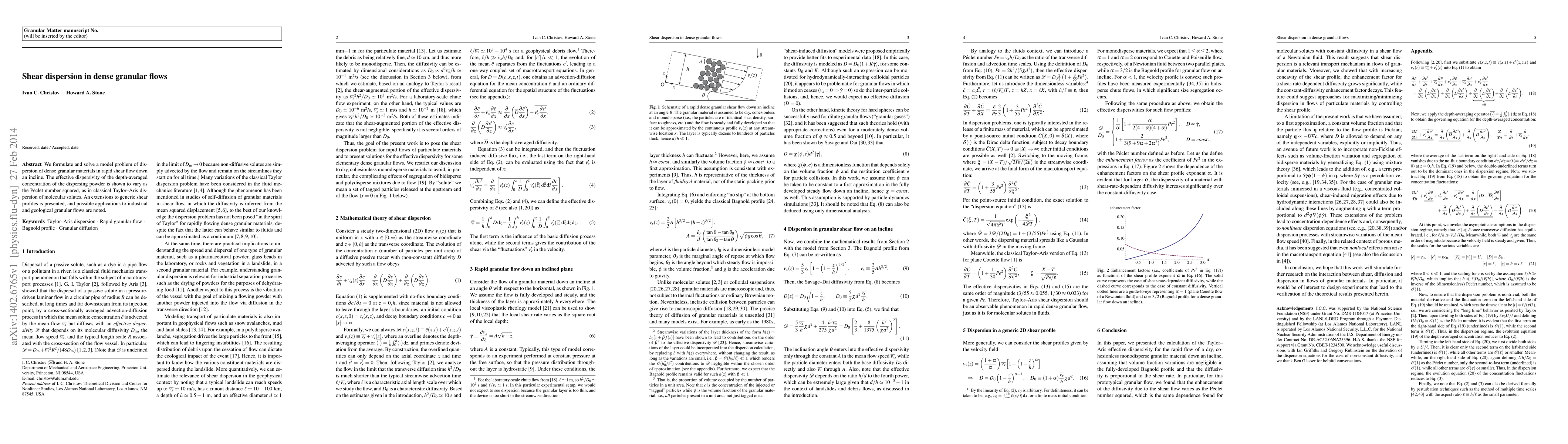 We formulate and solve a model problem of dispersion of dense granular materials in rapid shear flow down an incline. The effective dispersivity of the depth-averaged concentration of the dispersing powder is shown to vary as the P\'eclet number squared, as in classical Taylor--Aris dispersion of molecular solutes. An extensions to generic shear profiles is presented, and possible applications to industrial and geological granular flows are noted.