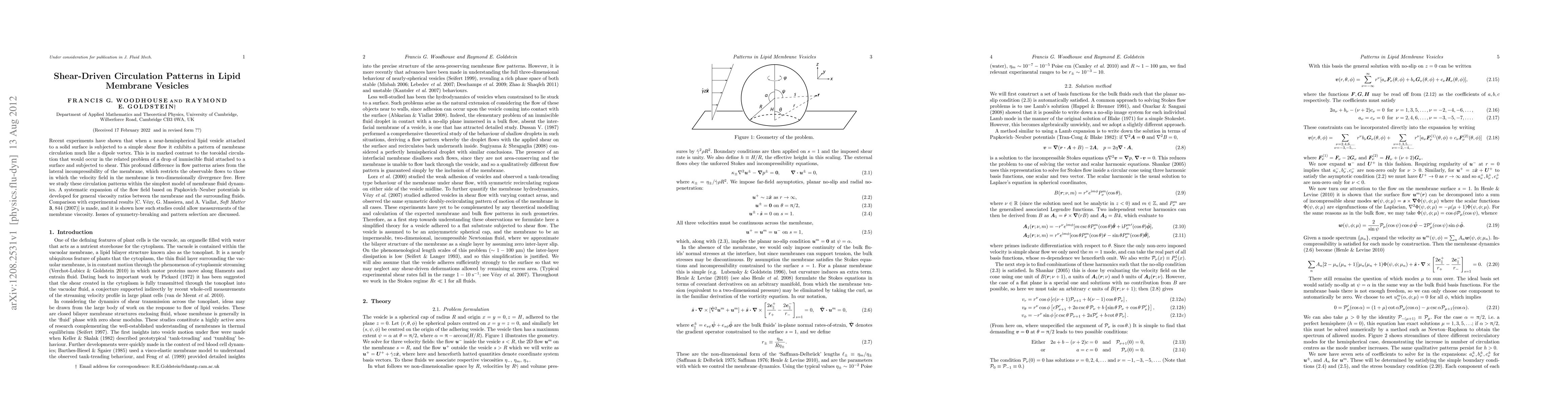 Recent experiments have shown that when a near-hemispherical lipid vesicle attached to a solid surface is subjected to a simple shear flow it exhibits a pattern of membrane circulation much like a dipole vortex. This is in marked contrast to the toroidal circulation that would occur in the related problem of a drop of immiscible fluid attached to a surface and subjected to shear. This profound difference in flow patterns arises from the lateral incompressibility of the membrane, which restricts the observable flows to those in which the velocity field in the membrane is two-dimensionally divergence free. Here we study these circulation patterns within the simplest model of membrane fluid dynamics. A systematic expansion of the flow field based on Papkovich--Neuber potentials is developed for general viscosity ratios between the membrane and the surrounding fluids. Comparison with experimental results [C. V\'ezy, G. Massiera, and A. Viallat, Soft Matter 3, 844 (2007)] is made, and it is shown how such studies could allow measurements of the membrane viscosity. Issues of symmetry-breaking and pattern selection are discussed.