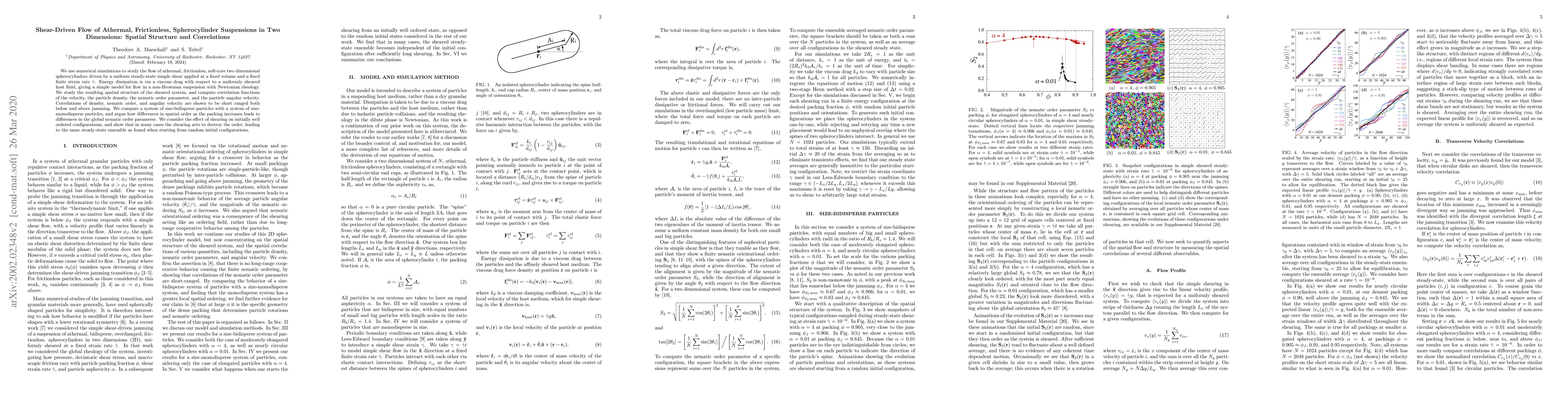 We use numerical simulations to study the flow of athermal, frictionless, soft-core two dimensional spherocylinders driven by a uniform steady-state simple shear applied at a fixed volume and a fixed finite strain rate $\dot\gamma$. Energy dissipation is via a viscous drag with respect to a uniformly sheared host fluid, giving a simple model for flow in a non-Brownian suspension with Newtonian rheology. We study the resulting spatial structure of the sheared system, and compute correlation functions of the velocity, the particle density, the nematic order parameter, and the particle angular velocity. Correlations of density, nematic order, and angular velocity are shown to be short ranged both below and above jamming. We compare a system of size-bidisperse particles with a system of size-monodisperse particles, and argue how differences in spatial order as the packing increases leads to differences in the global nematic order parameter. We consider the effect of shearing on initially well ordered configurations, and show that in many cases the shearing acts to destroy the order, leading to the same steady-state ensemble as found when starting from random initial configurations.