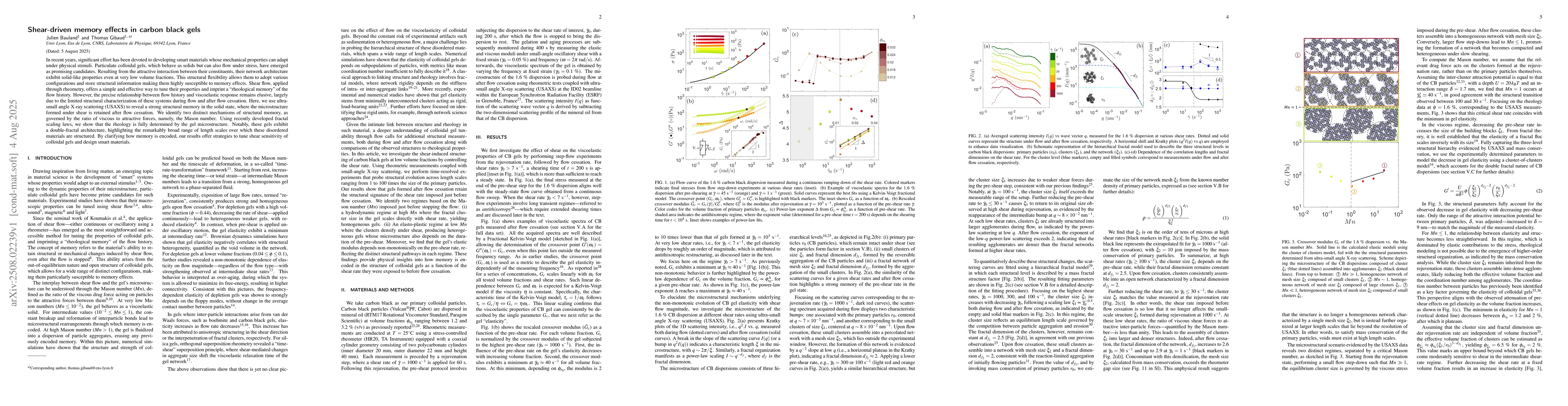 In recent years, significant effort has been devoted to developing smart materials whose mechanical properties can adapt under physical stimuli. Particulate colloidal gels, which behave as solids but can also flow under stress, have emerged as promising candidates. Resulting from the attractive interaction between their constituents, their network architecture exhibit solid-like properties even at very low volume fractions. This structural flexibility allows them to adopt various configurations and store structural information making them highly susceptible to memory effects. Shear flow, applied through rheometry, offers a simple and effective way to tune their properties and imprint a ``rheological memory'' of the flow history. However, the precise relationship between flow history and viscoelastic response remains elusive, largely due to the limited structural characterization of these systems during flow and after flow cessation. Here, we use ultra-small angle X-ray scattering (USAXS) to reveal a strong structural memory in the solid state, where the microstructure formed under shear is retained after flow cessation. We identify two distinct mechanisms of structural memory, as governed by the ratio of viscous to attractive forces, namely, the Mason number. Using recently developed fractal scaling laws, we show that the rheology is fully determined by the gel microstructure. Notably, these gels exhibit a double-fractal architecture, highlighting the remarkably broad range of length scales over which these disordered materials are structured. By clarifying how memory is encoded, our results offer strategies to tune shear sensitivity of colloidal gels and design smart materials.