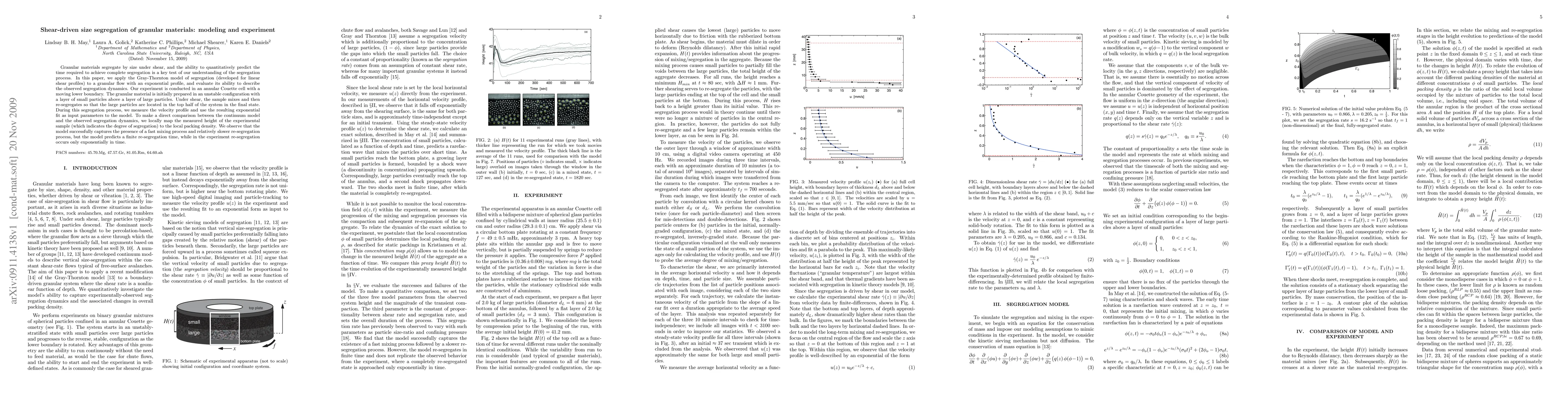 This paper investigates the shear-driven size segregation of granular materials using both a modified Gray-Thornton model and experimental setup in an annular Couette cell. The model successfully captures the mixing and re-segregation dynamics but predicts a finite re-segregation time, whereas experimental results show an exponential re-segregation process.