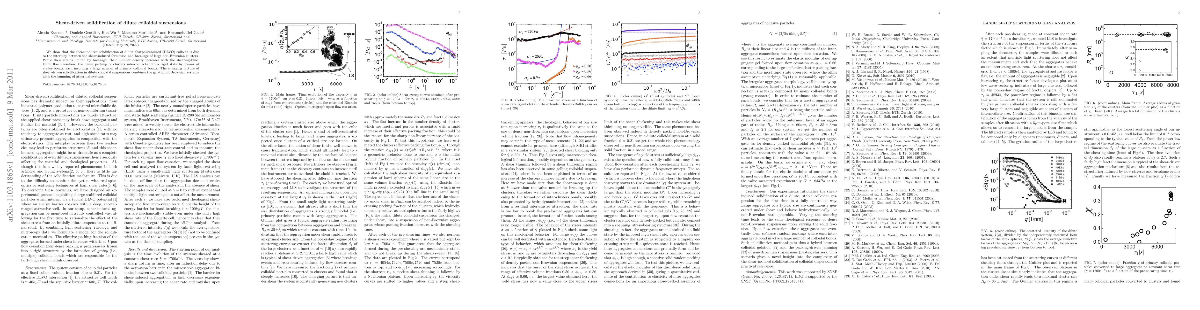 This paper explores the shear-induced solidification of dilute colloidal suspensions, revealing that it results from the formation and subsequent breakage of large clusters under shear, leading to a rigid state upon cessation due to the dense packing and interconnection of these clusters. The process combines elements of both gelation and jamming.
