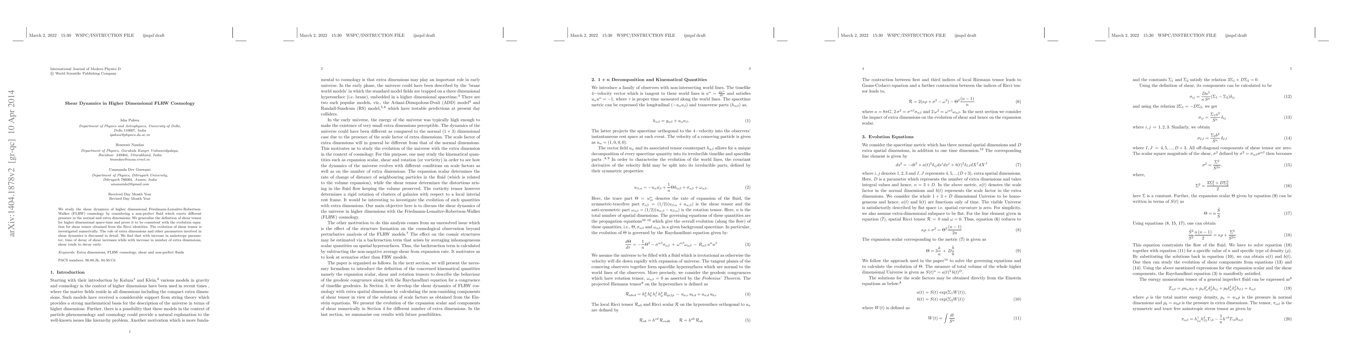 This paper explores the shear dynamics in higher-dimensional FLRW cosmology using a non-perfect fluid with varying pressures in normal and extra dimensions. It generalizes the shear tensor definition and numerically investigates its evolution, finding that shear decay time increases with anisotropy but decreases with more extra dimensions.