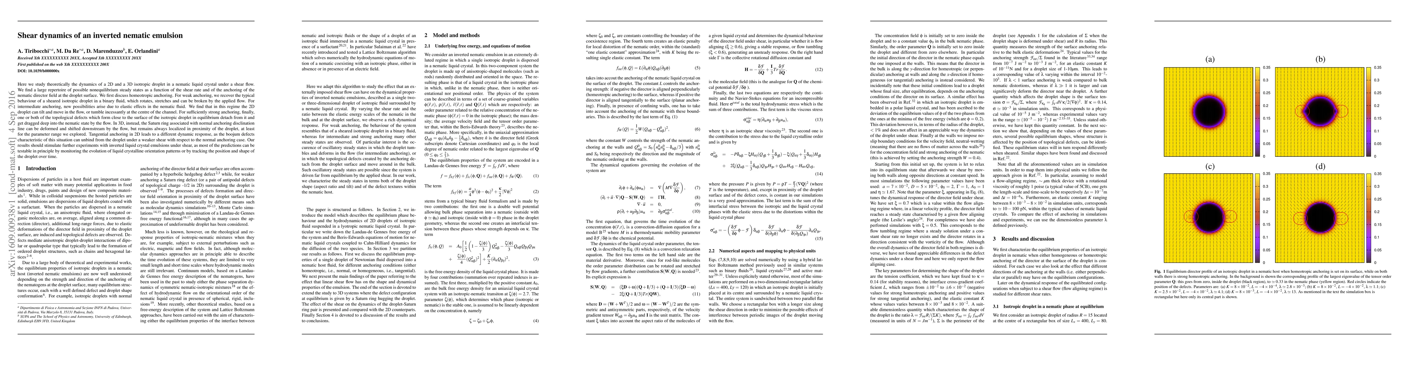 Here we study theoretically the dynamics of a 2D and a 3D isotropic droplet in a nematic liquid crystal under a shear flow. We find a large repertoire of possible nonequilibrium steady states as a function of the shear rate and of the anchoring of the nematic director field at the droplet surface. We first discuss homeotropic anchoring. For weak anchoring, we recover the typical behaviour of a sheared isotropic droplet in a binary fluid, which rotates, stretches and can be broken by the applied flow. For intermediate anchoring, new possibilities arise due to elastic effects in the nematic fluid. We find that in this regime the 2D droplet can tilt and move in the flow, or tumble incessantly at the centre of the channel. For sufficiently strong anchoring, finally, one or both of the topological defects which form close to the surface of the isotropic droplet in equilibrium detach from it and get dragged deep into the nematic state by the flow. In 3D, instead, the Saturn ring associated with normal anchoring disclination line can be deformed and shifted downstream by the flow, but remains always localized in proximity of the droplet, at least for the parameter range we explored. Tangential anchoring in 2D leads to a different dynamic response, as the boojum defects characteristic of this situation can unbind from the droplet under a weaker shear with respect to the normal anchoring case. Our results should stimulate further experiments with inverted liquid crystal emulsions under shear, as most of the predictions can be testable in principle by monitoring the evolution of liquid crystalline orientation patterns or by tracking the position and shape of the droplet over time.