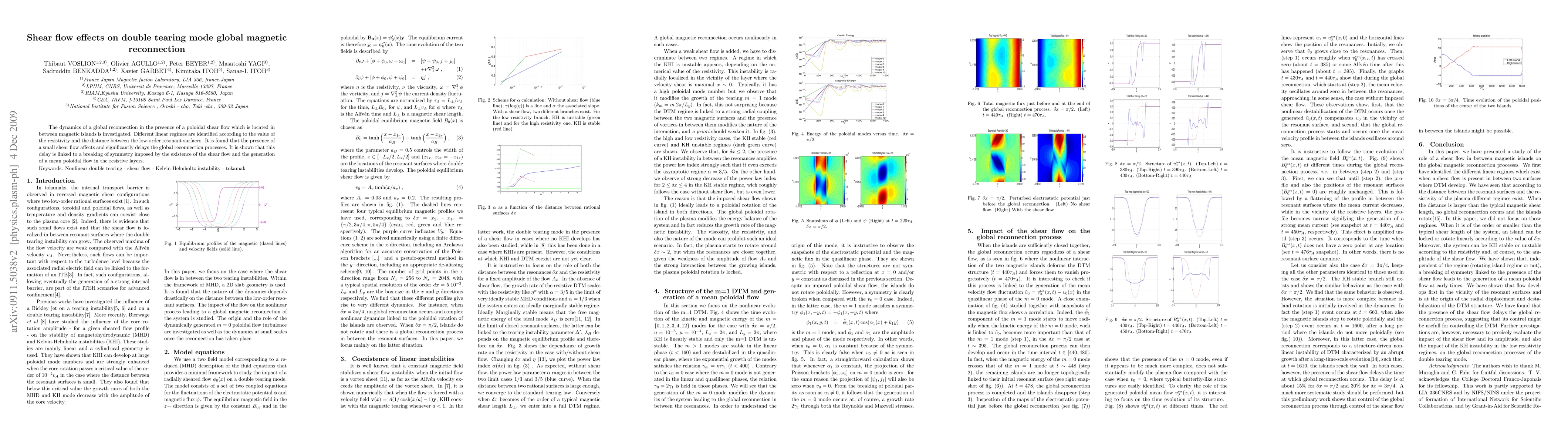 The dynamics of a global reconnection in the presence of a poloidal shear flow which is located in between magnetic islands is investigated. Different linear regimes are identified according to the value of the resistivity and the distance between the low-order resonant surfaces. It is found that the presence of a small shear flow affects and significantly delays the global reconnection processes. It is shown that this delay is linked to a breaking of symmetry imposed by the existence of the shear flow and the generation of a mean poloidal flow in the resistive layers.